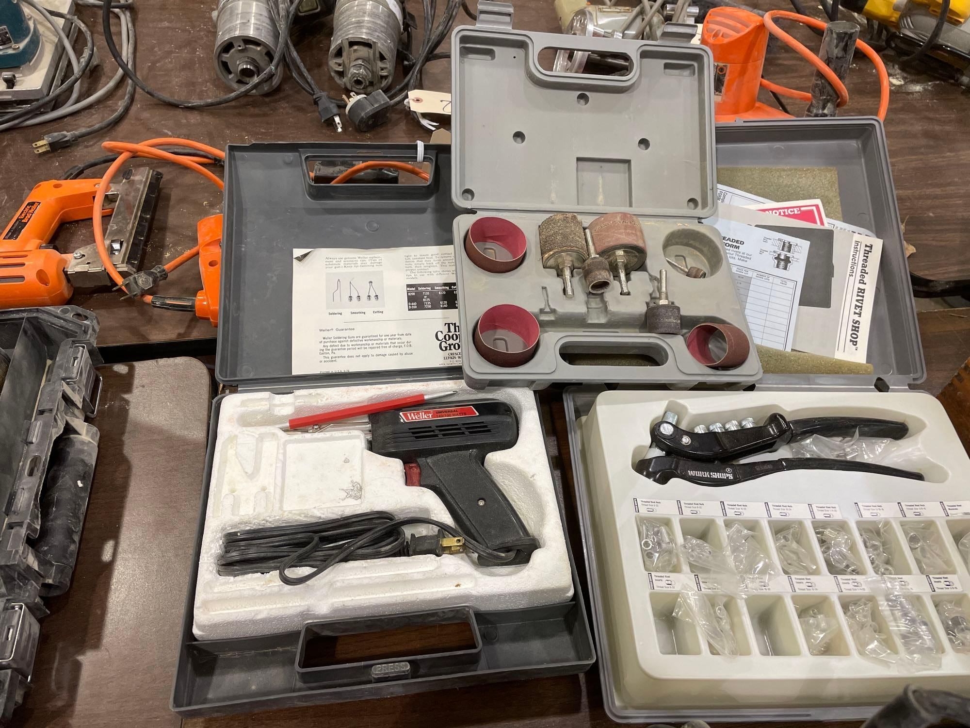 A Weller Soldering Gun ,n Barrel Grinder Attachment for a Drill, Along with a Work Shops Threaded Rivet Set