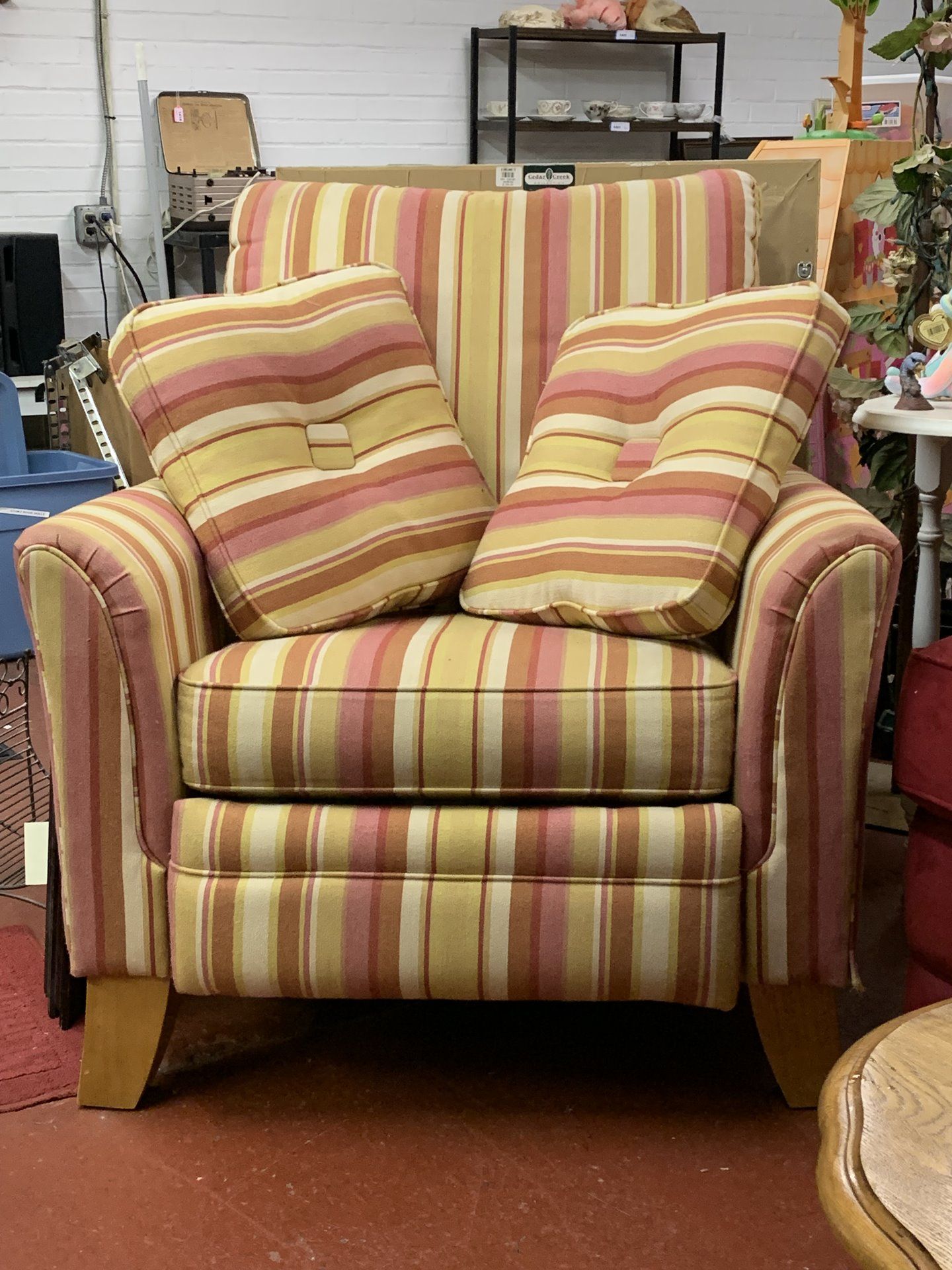 LAZBOY UPHOLSTERED RECLINER W/ 2 MATCHING PILLOWS (LITTLE DAMAGE ON EDGE OF LEG SEE PIC) 36" WIDE X 35" DEEP X 40" TALL