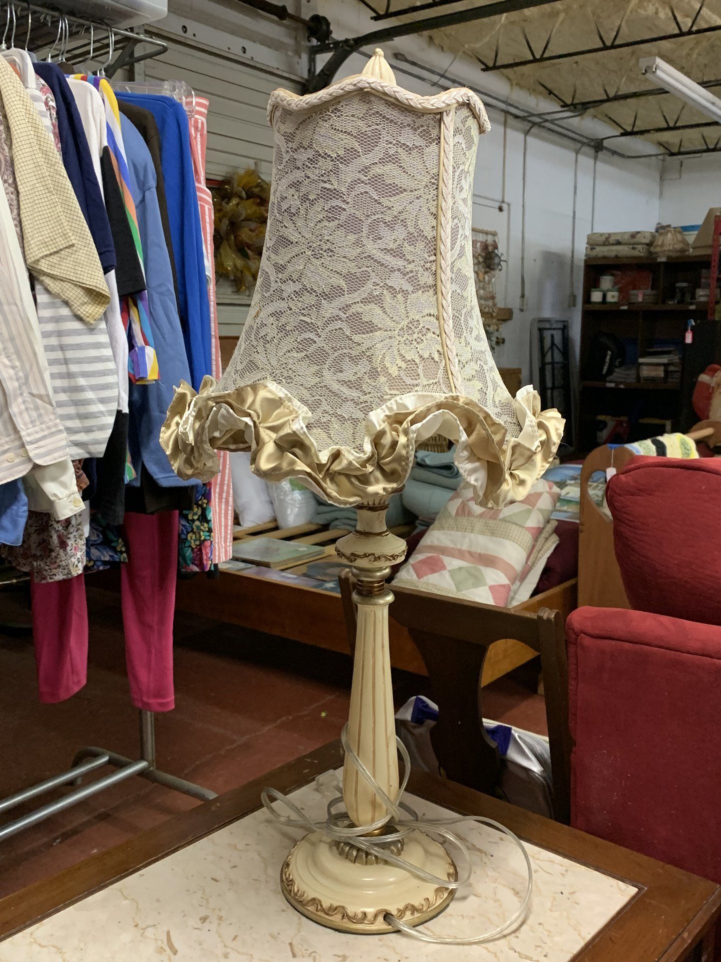 ALMOND COLORED LAMP WITH FANCY LAMP SHADE 29" TALL