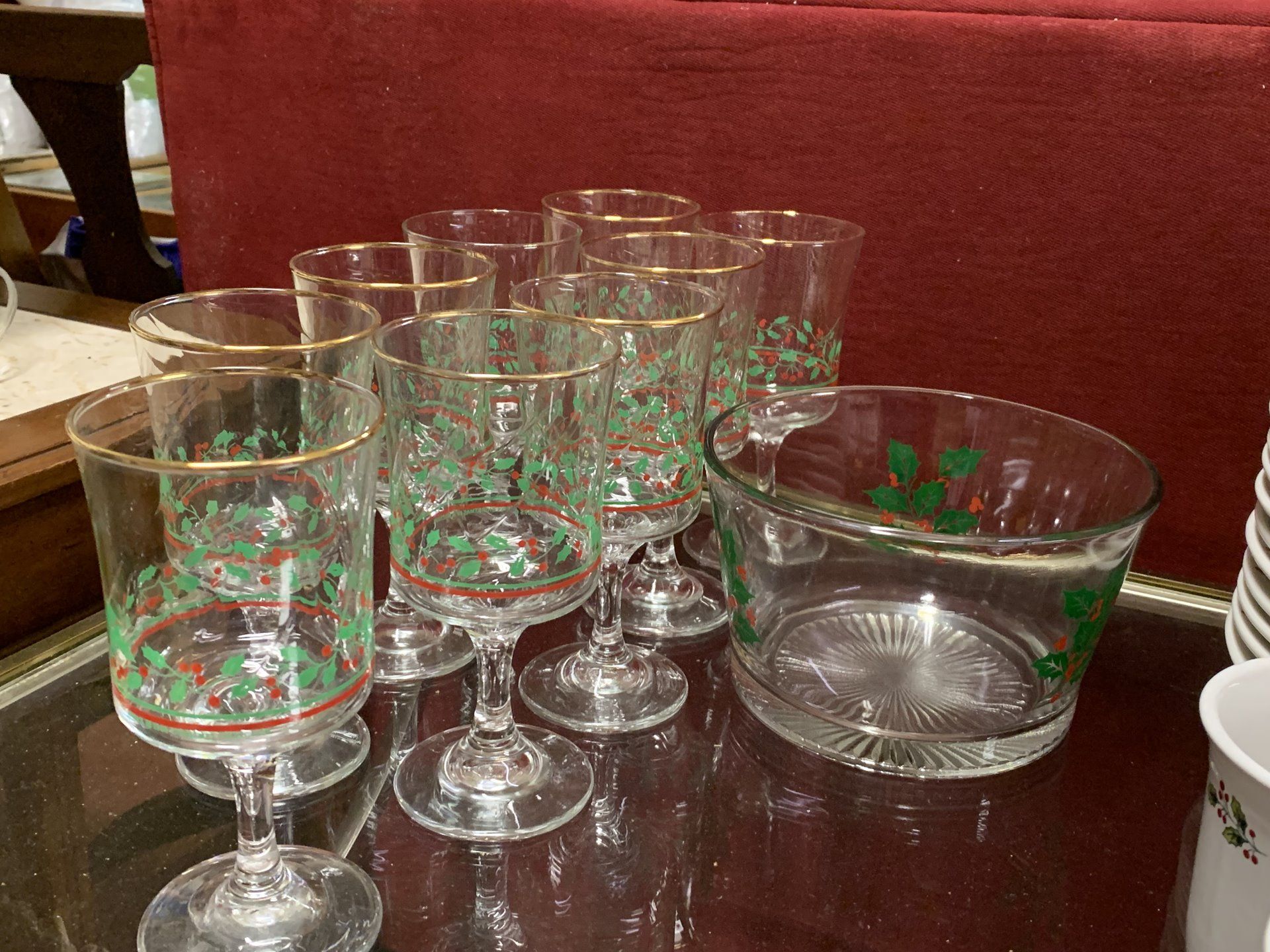 9 STEMMED WINE/WATER HOLLY PATTERN GLASSES & HOLLY PATTERN SERVING BOWL