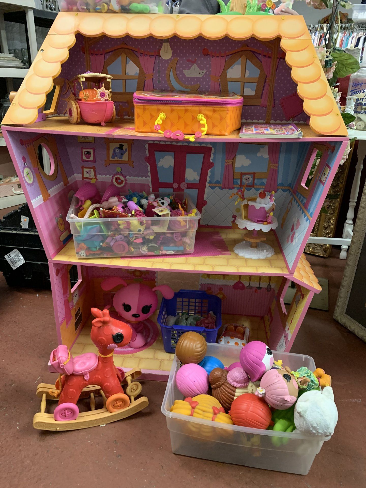 LALALOOPSY DOLLHOUSE, DOLLS AND LOTS OF ACCESSORIES (DOLLHOUSE 35" WIDE X 15" DEEP X 43" TALL) CONTAINERS NOT INCLUDED