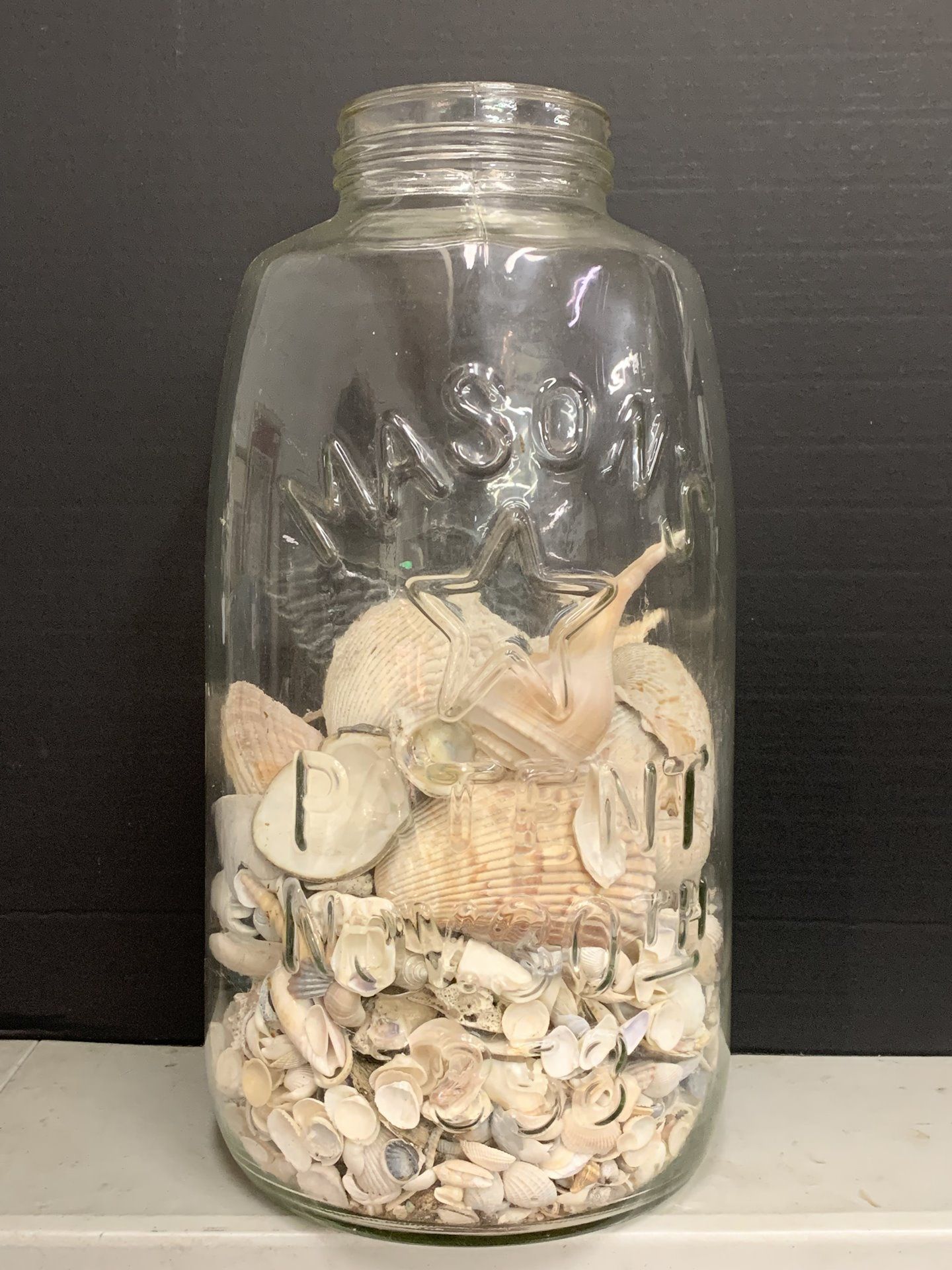 EXTRA LARGE MASON GLASS JAR FULL OF SEASHELLS 21" TALL