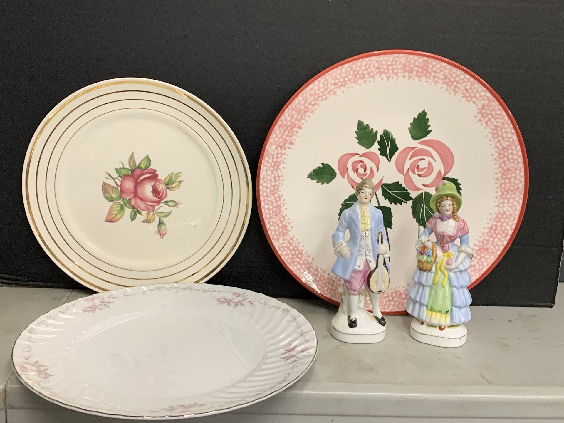 3 VINTAGE DINNER PLATES & PAIR RED LETTER JAPAN FIGURINES 6 1/2" TALL