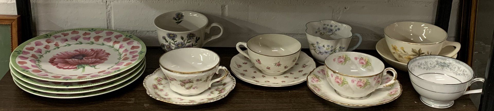 SHELF LOT OF ASSORTED VINTAGE TEA CUPS/SAUCERS & 4 DESSERT PLATES