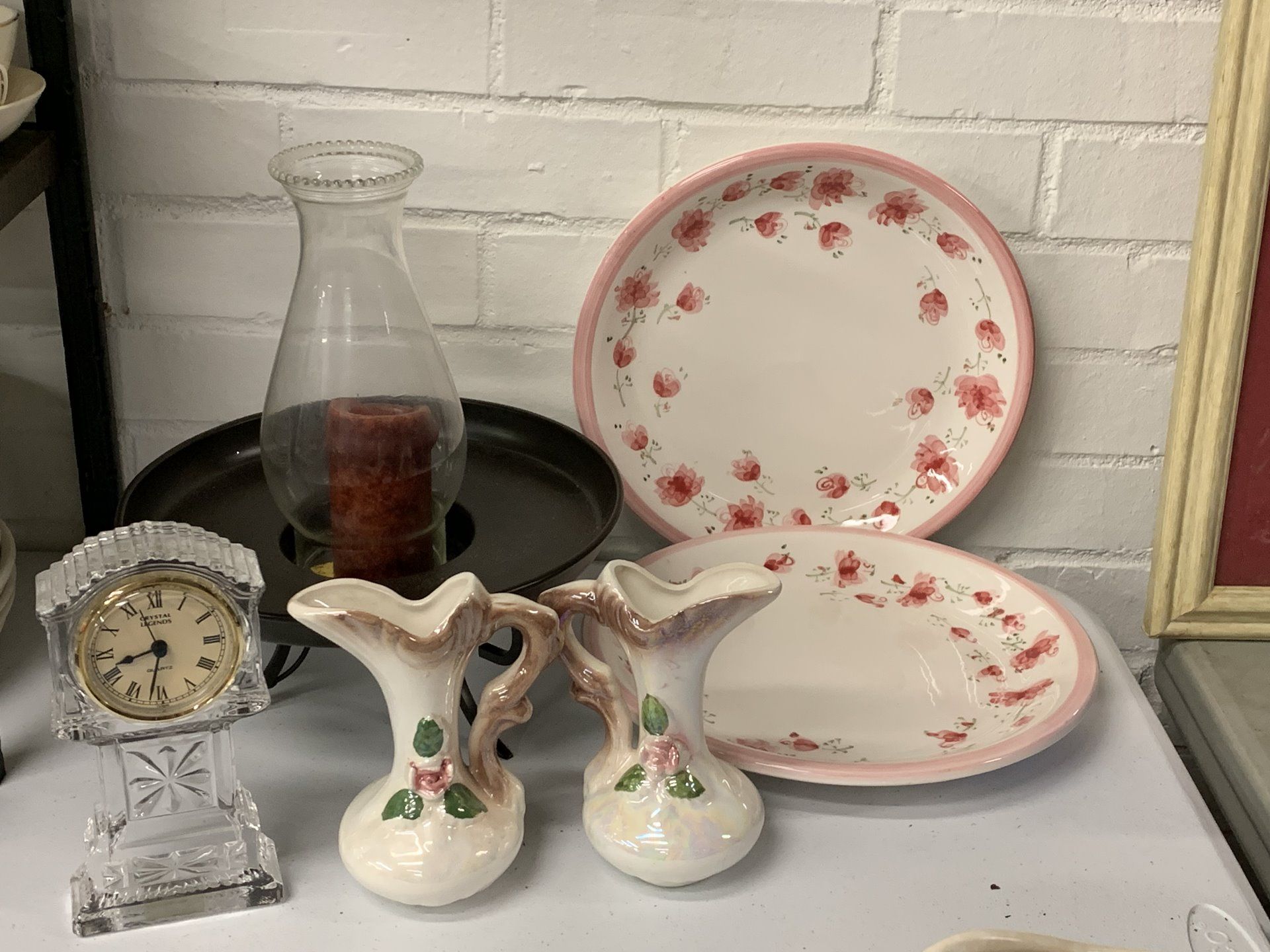 2 PINK/WHITE GIBSON DINNER PLATES, BRONZE METAL CANDLE STAND & MORE