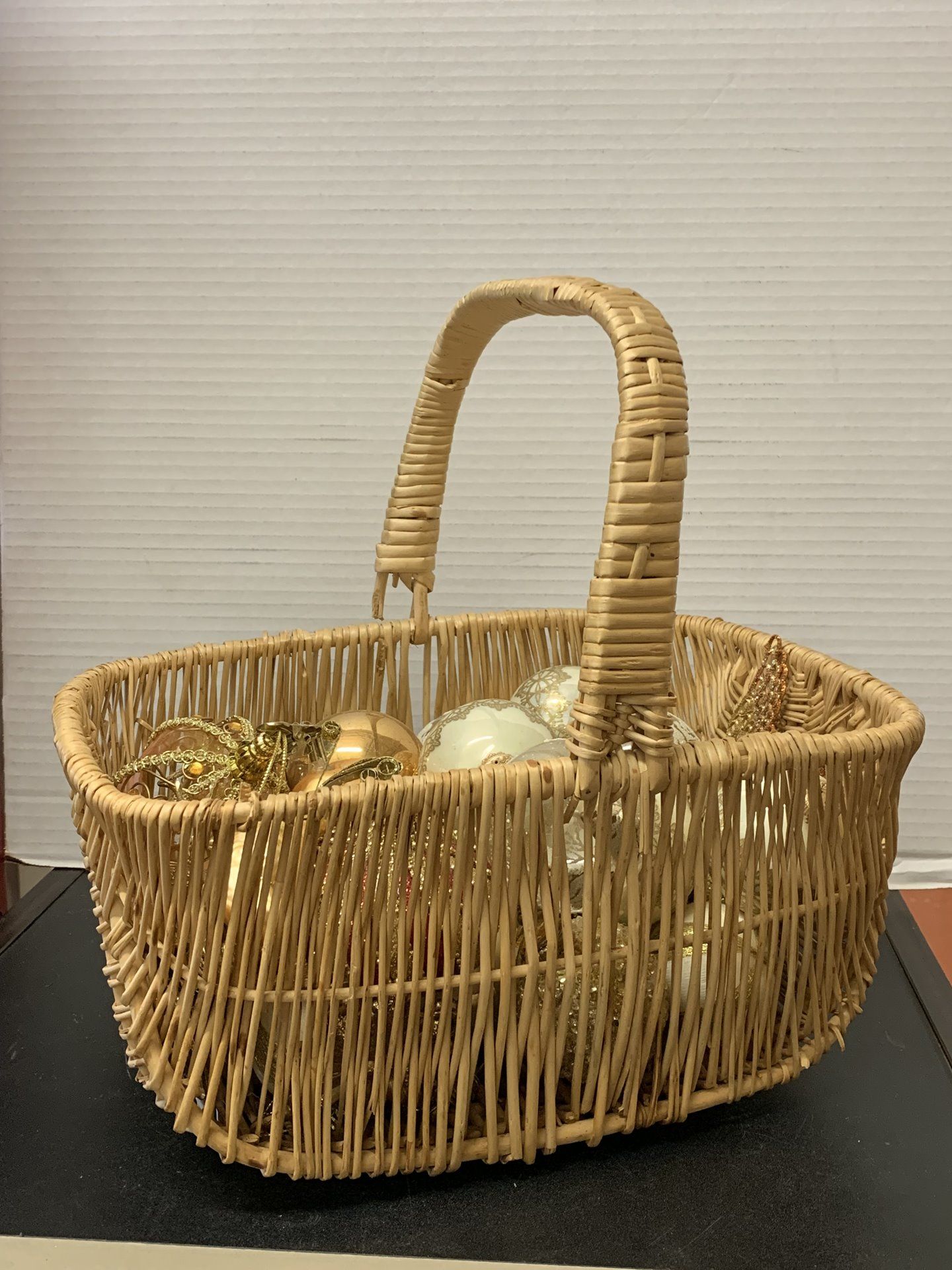 BASKET OF ASSORTED GLASS ORNAMENTS MOSTLY VINTAGE