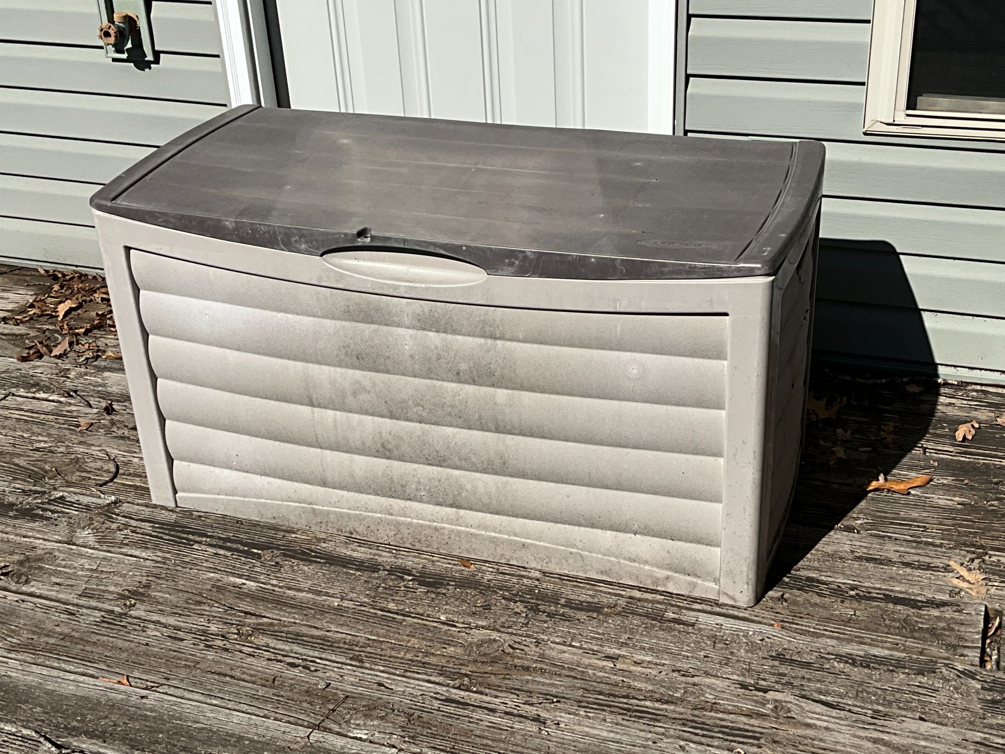Suncast deck box, 46" W x 21" D x 24" T and contents