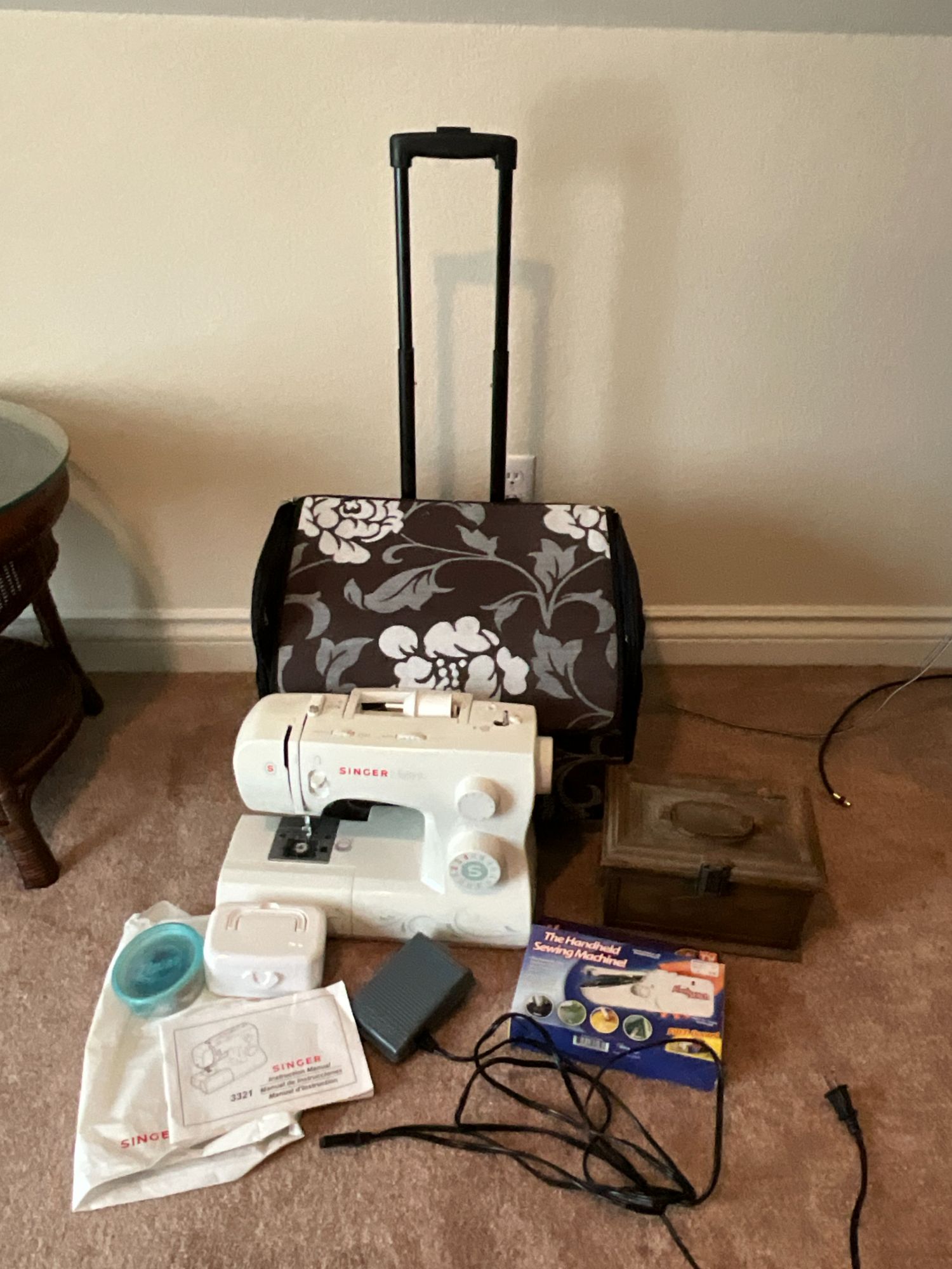 working condition, accessories, rolling bag, sewing box, bobbin winder, etc.