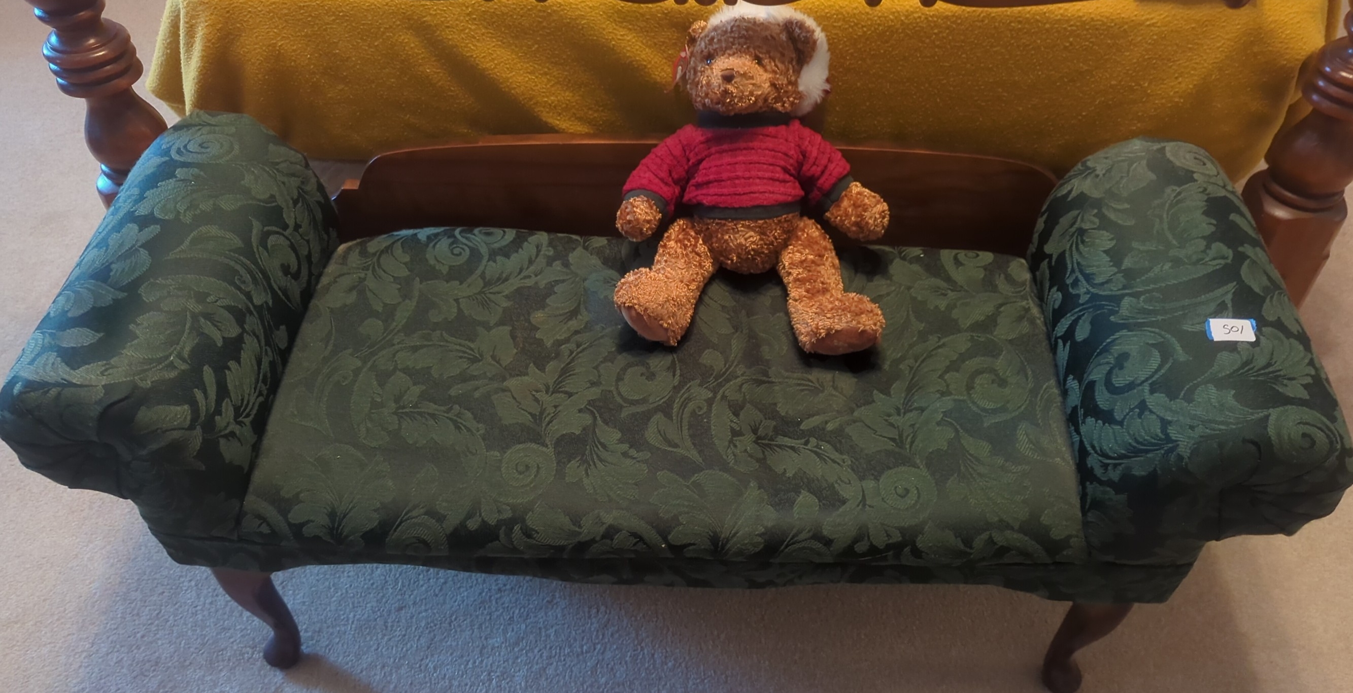 This is a lovely small settee-style bench. It features a dark wood frame with an upholstered seat and armrests. The fabric is a decorative green pattern.
