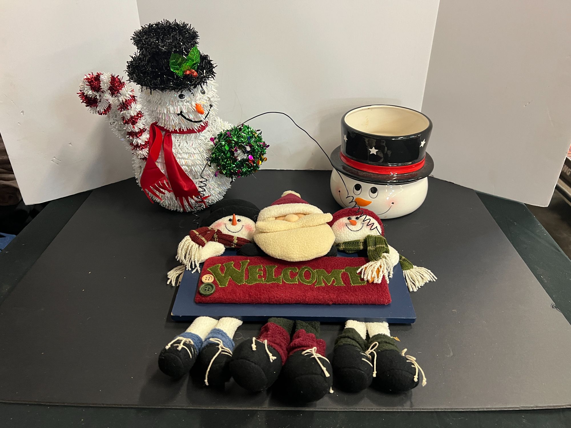 Assorted Christmas decor to include snowman vase, snowman, and Santa welcome wall decor. See pictures or details.