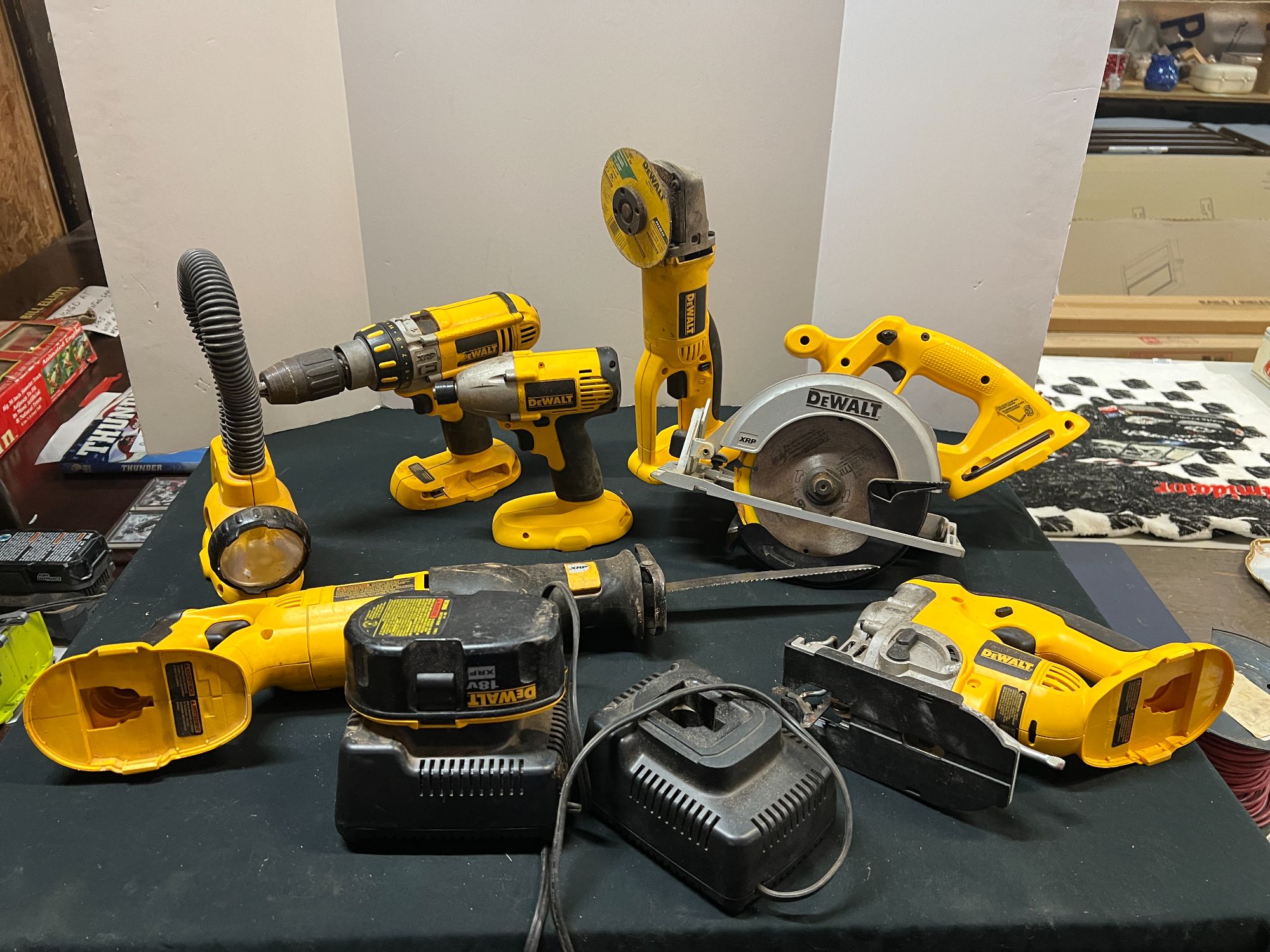 Assorted DeWalt 18V tool set with carrying bag, comes with circular saw, heavy duty cut off tool, impact driver, drill, reciprocating saw, and more. Also comes with two chargers and one battery, seller states all pieces work except flashlight, this piece needs a bulb, see pictures for details.