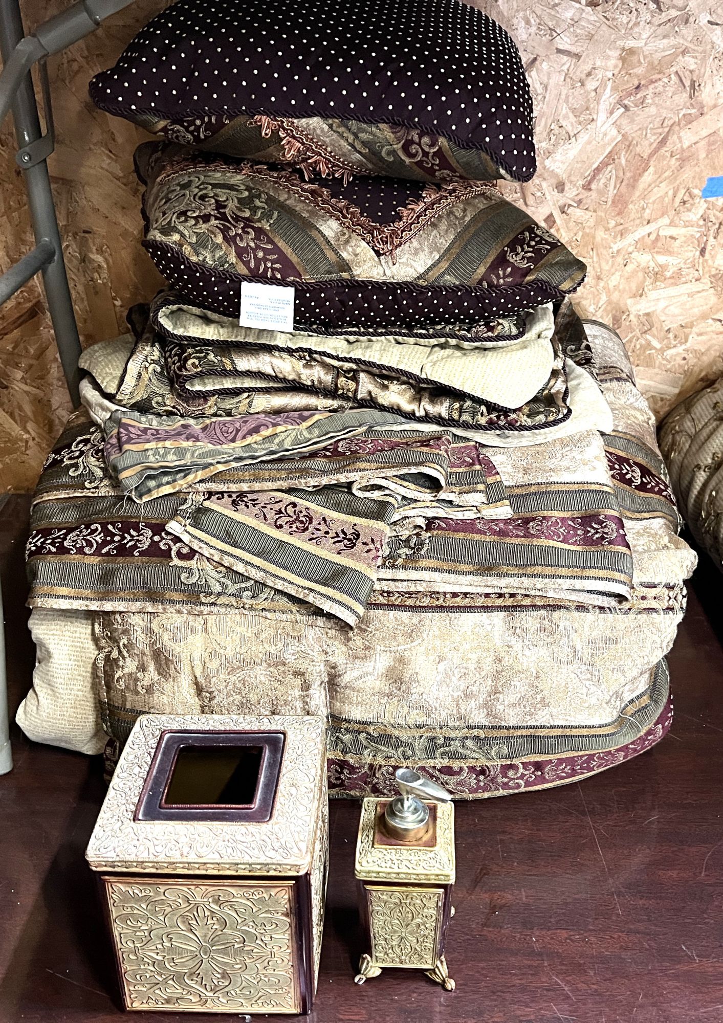 Crosscill comforter set, comes with comforter, bed skirt, pillow shams, and more. Also includes tissue box and soap dispenser. See pictures for details.