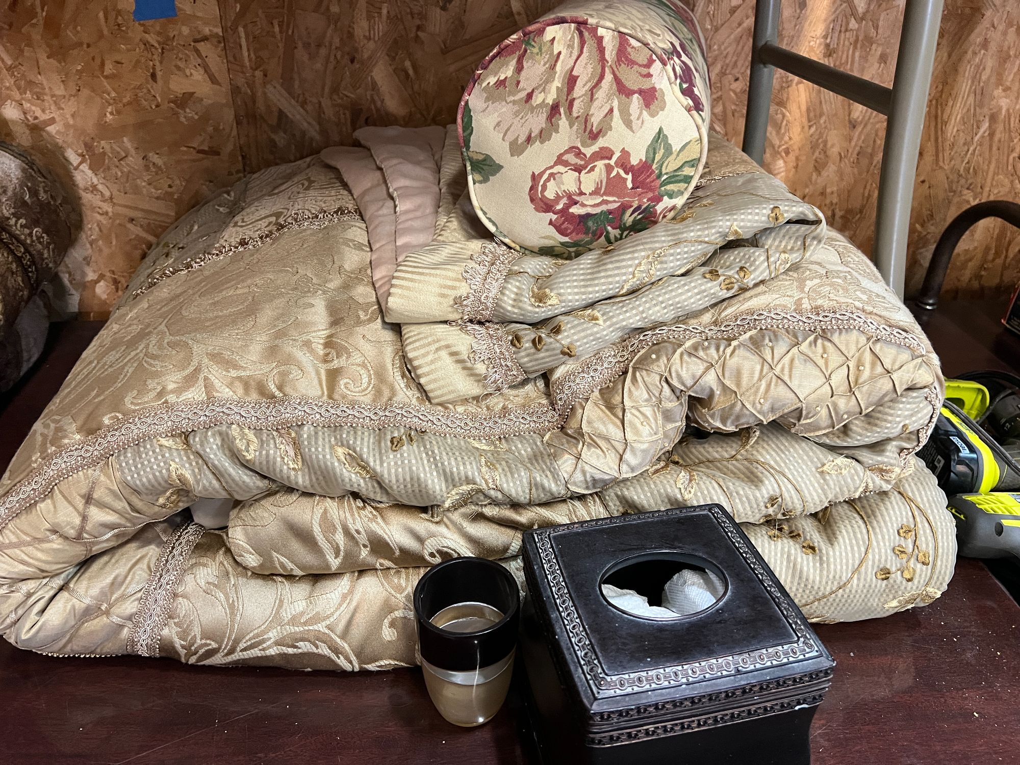 Victoria Classics California King comforter set with pillow shams, pillow, comforter, also includes tissue box and bathroom cup, see pictures for details.
