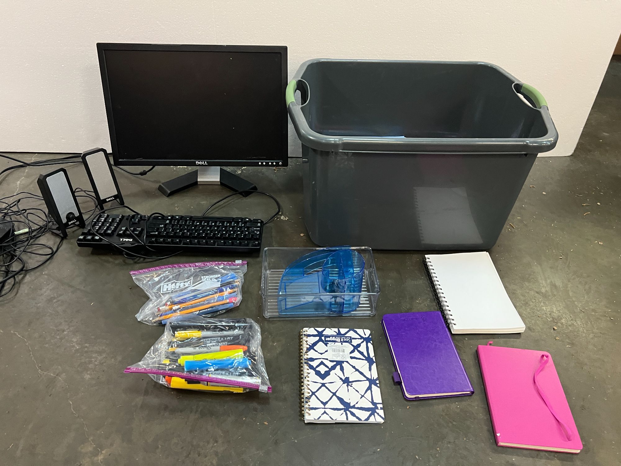 Office supply lot to include a Dell monitor and keyboard, speakers, markers, sticky notes, and much more. See pictures for details.