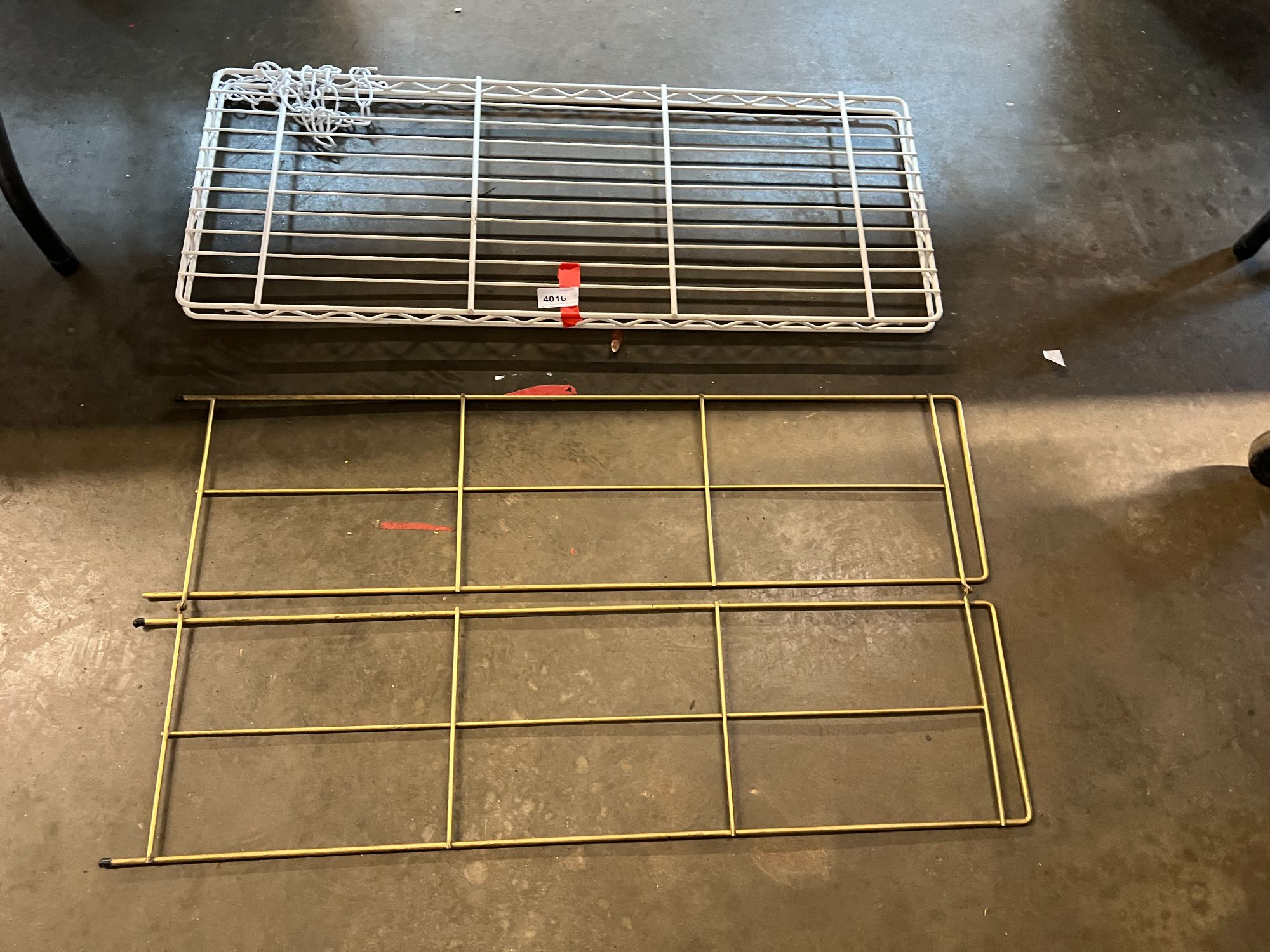 Folding, standing wire rack, also includes a coated wire hanging shelf, see pictures for details.