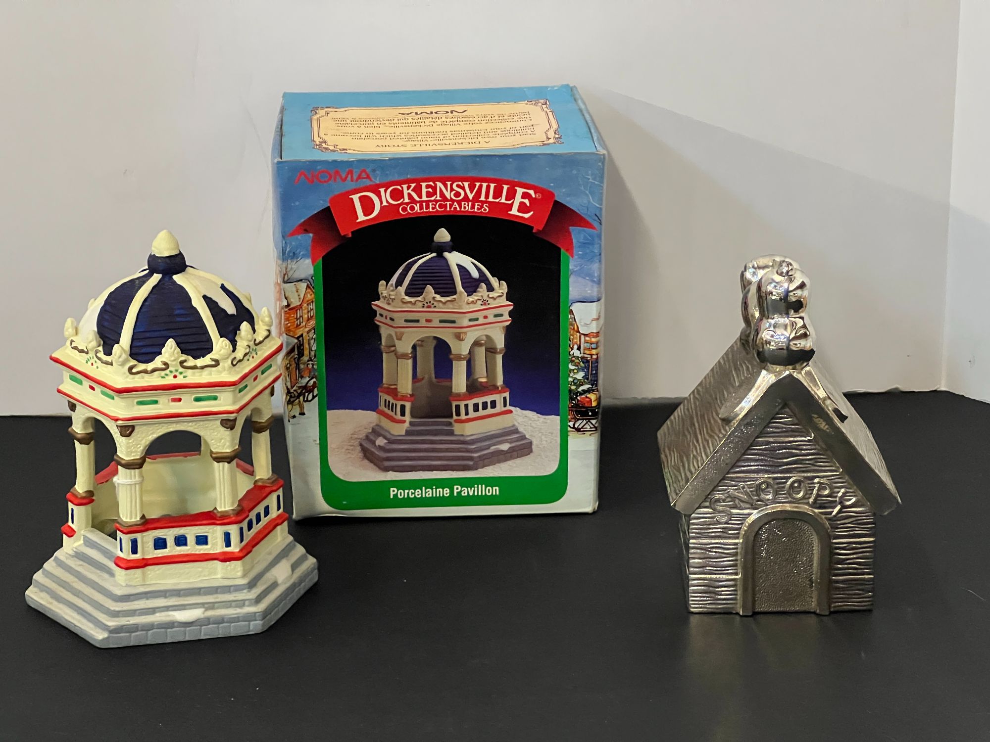 DickensVille collectibles, porcelain pavilion, also includes a snoopy doghouse coin Bank, see pictures or details.