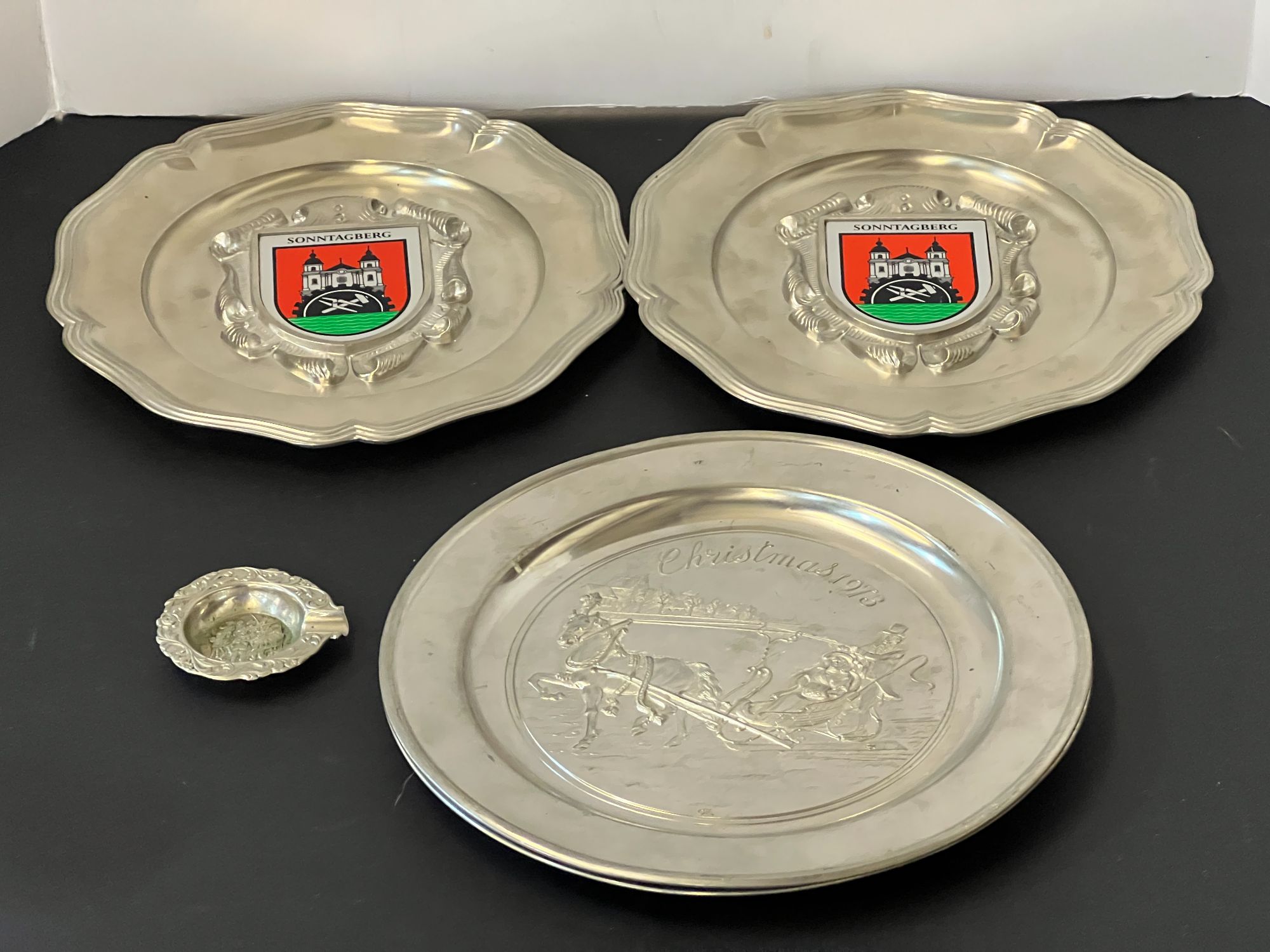 German pewter souvenir wall plates, set of two, also includes a vintage pewter Christmas wall plate, and more. See pictures for details.