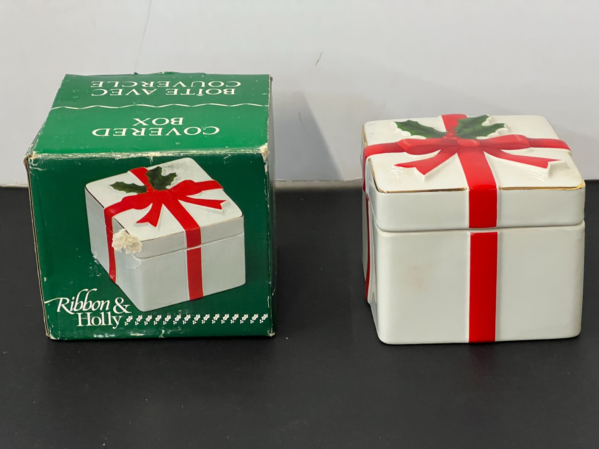 Vintage Ribbons & Holly covered porcelain Christmas box decoration, comes with original box, see pictures for details.