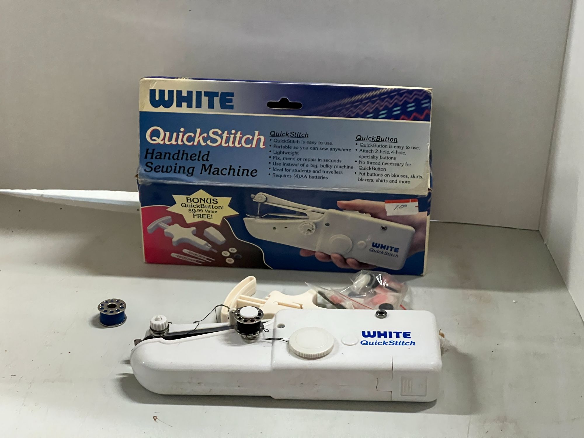 White quick stitch handheld sewing machine, comes with original box, see pictures for details.