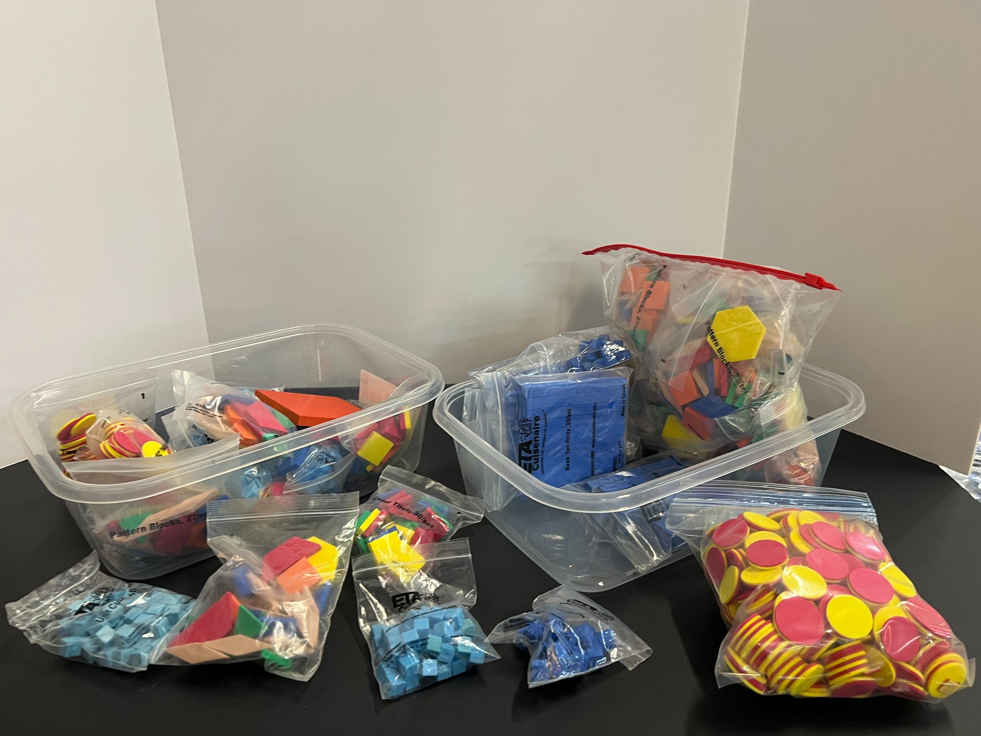 ETA Cuisenaire pattern blocks, color tiles, cube sets, and more. Tubs are not included, see pictures or details.