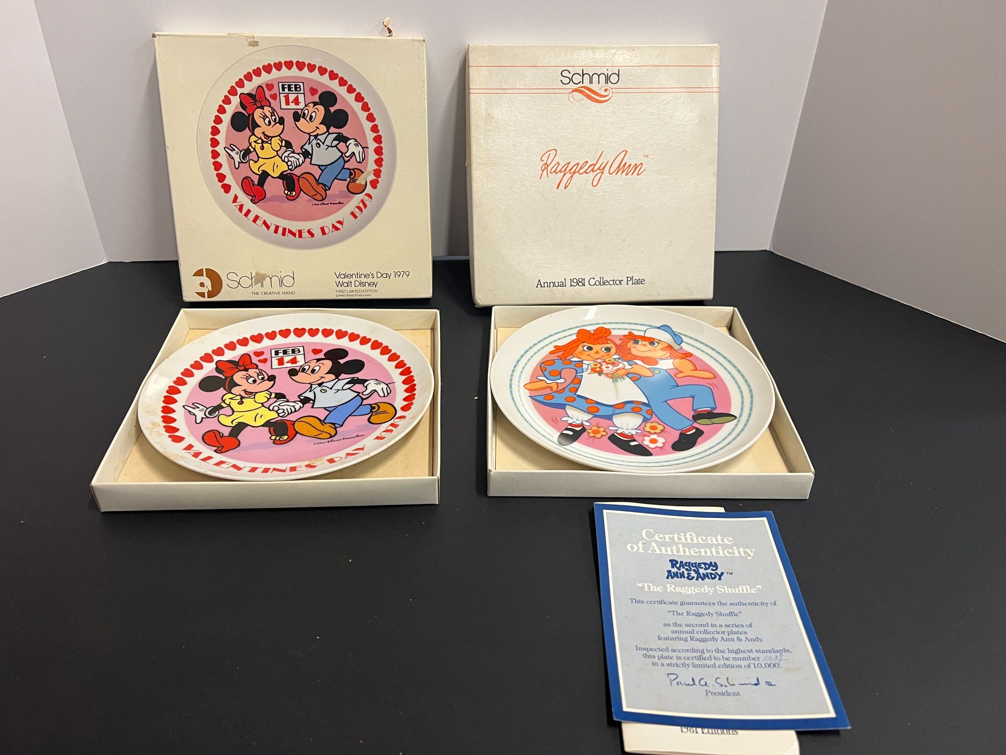 Schmid vintage collector plates to include Raggedy Ann, and Walt Disney Valentine’s Day, both come with the original boxes, see pictures or details.