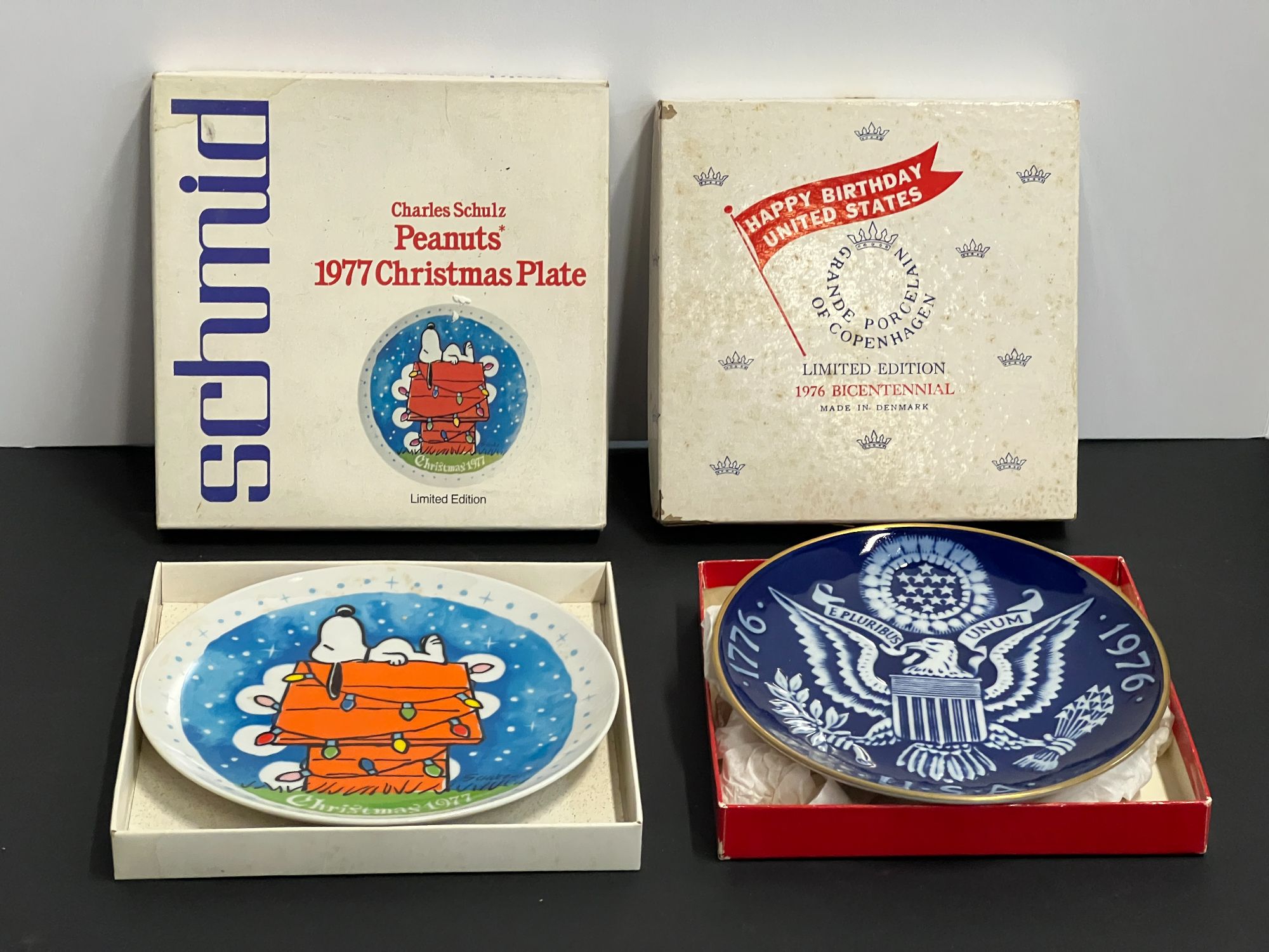 Schmid vintage Peanuts collector plate, also includes a 1976 bicentennial plate, Grande Porcelain of Copenhagen, both come in original boxes, see pictures for details.