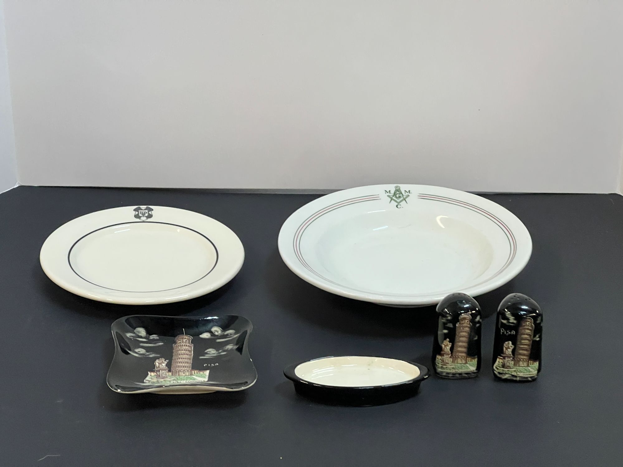 Logoed bowl and saucer, also include a souvenir plate and salt and pepper shaker from Pisa, see pictures for details.