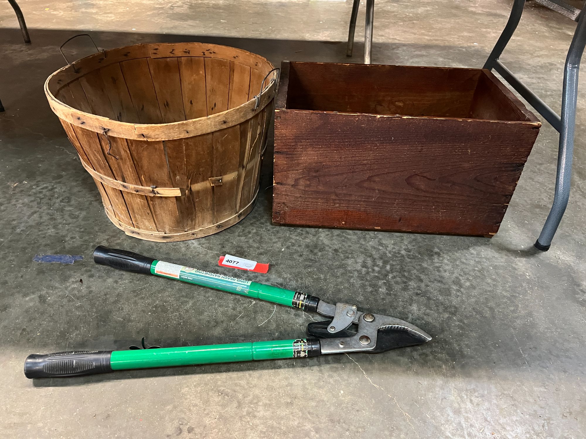 Produce basket, and wooden crate, also comes with bypass loppers, see pictures for details.