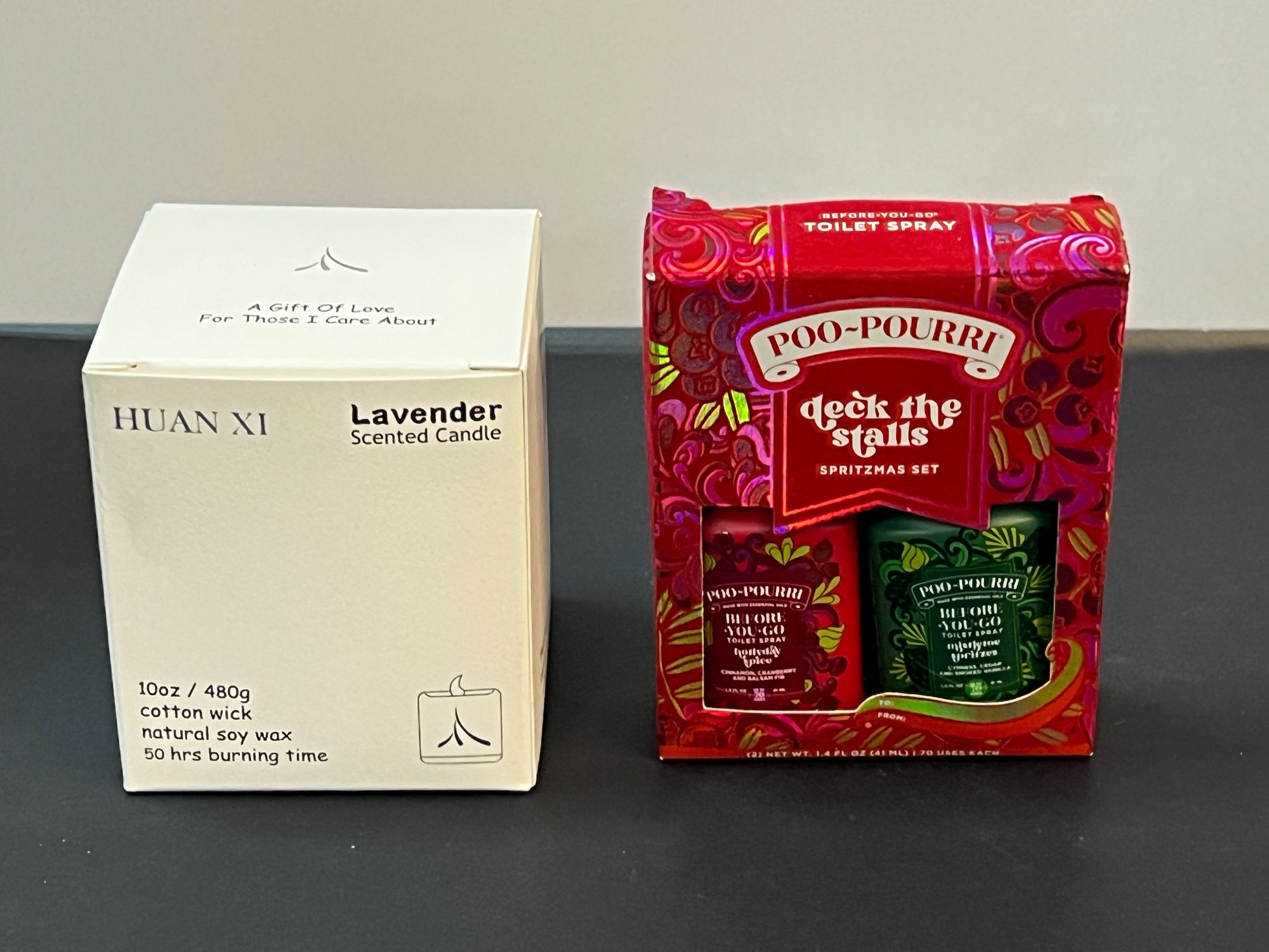 Deck the Halls Poo-Pourri two pack, also comes with a lavender scented natural soy candle, still new in the box, see pictures for details.