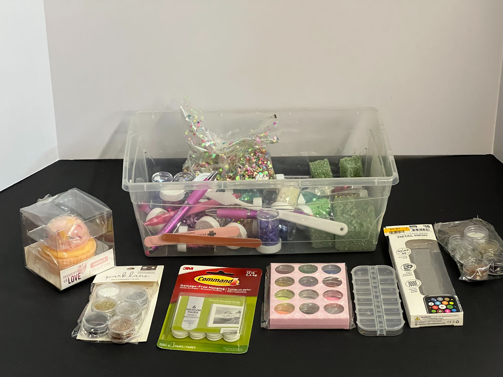 Assorted items to include crafting supplies, metal mesh Apple Watch band, cupcake candle, and more. Tub is not included, See pictures for details.