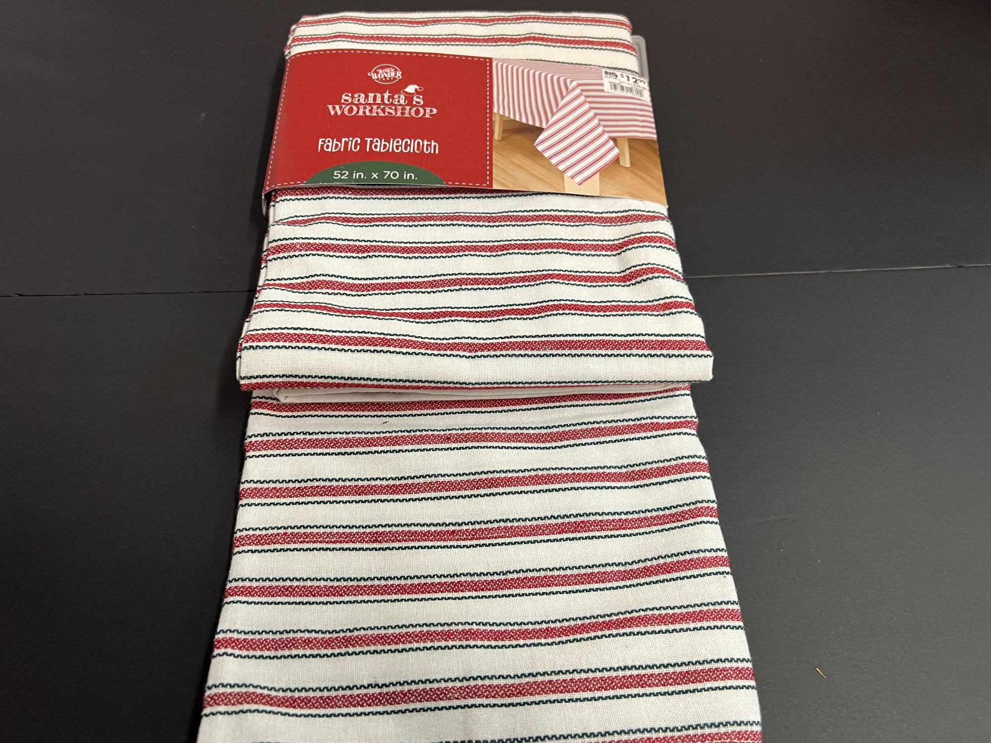 Santas workshop fabric tablecloth, 52” X 70”, still new in the package, see for details.