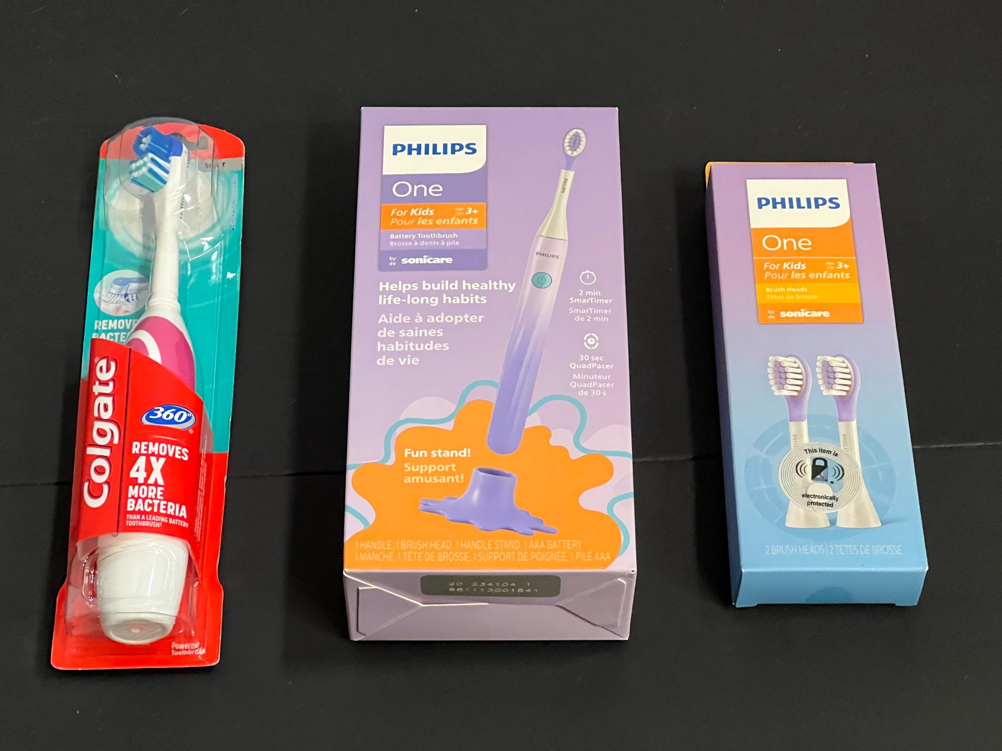 Colgate 360 battery powered toothbrush, also includes a Phillips One for kids, comes with two replacement brush heads, all are still new in the box, see pictures for details.