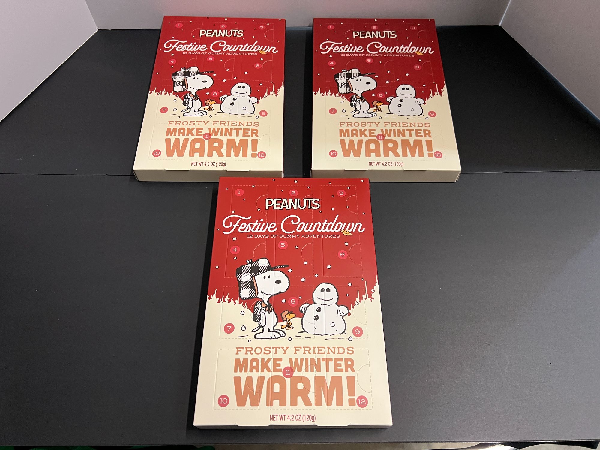 Peanuts “Festive Countdown, 12 Days of Gummy Adventures”, three unopened boxes, see pictures for details.