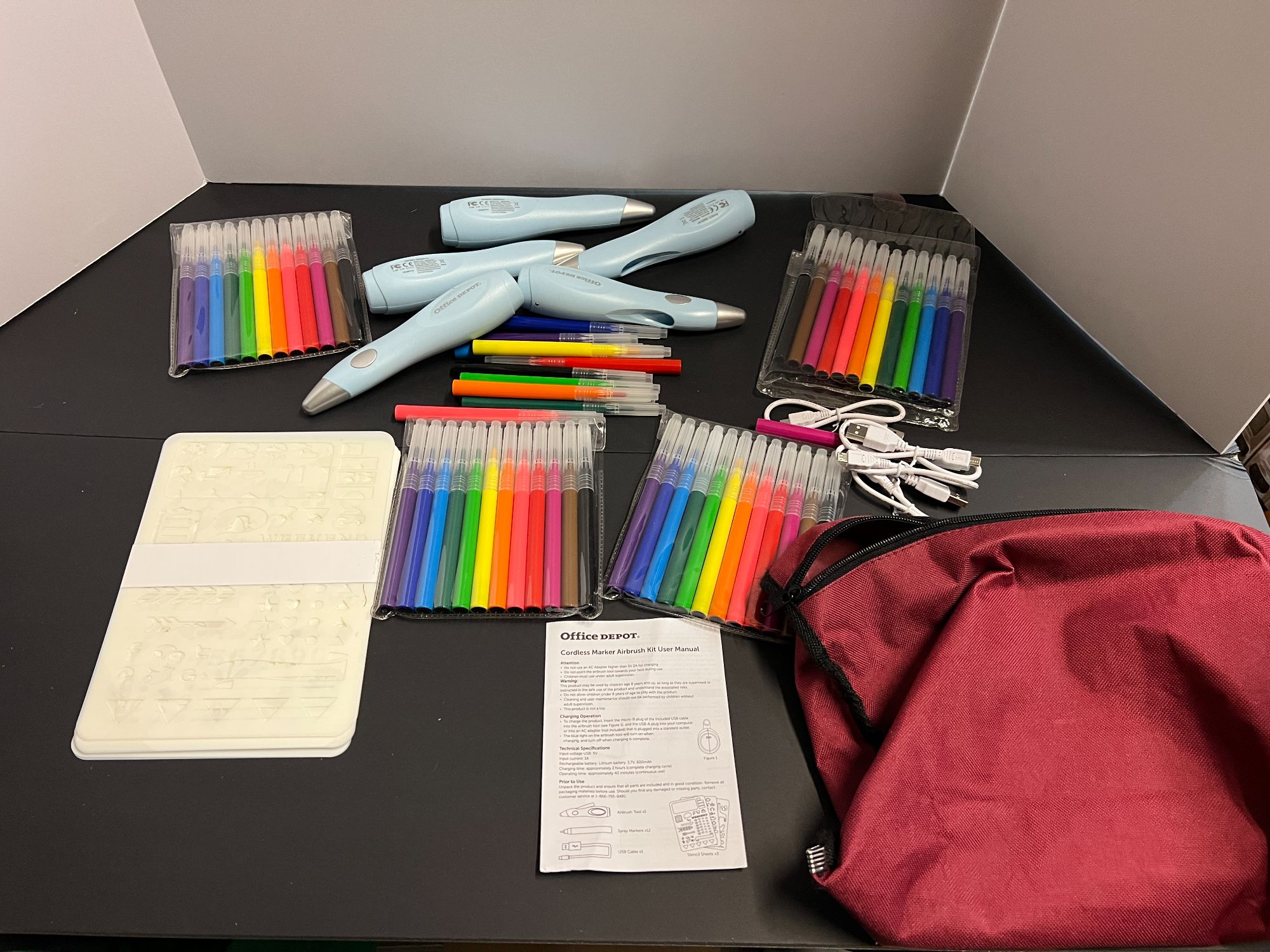 Office Depot cordless marker airbrush kit, comes with markers, charging cords, five air brushes, and stencil sheets, see pictures for details.