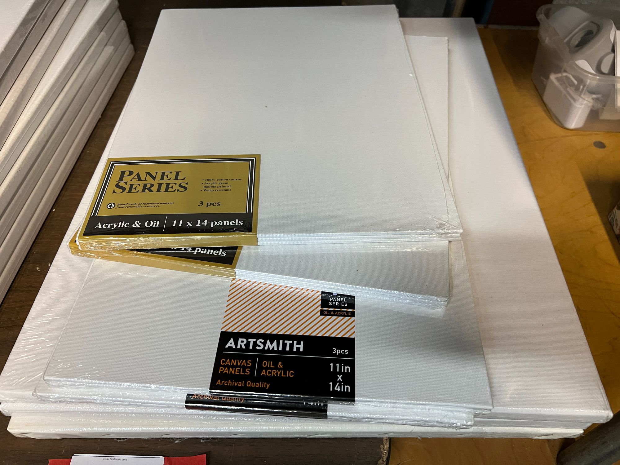 Acrylic and oil panels, four packs of three, also includes stretched canvases, three pieces, all are unopened, see pictures or details.