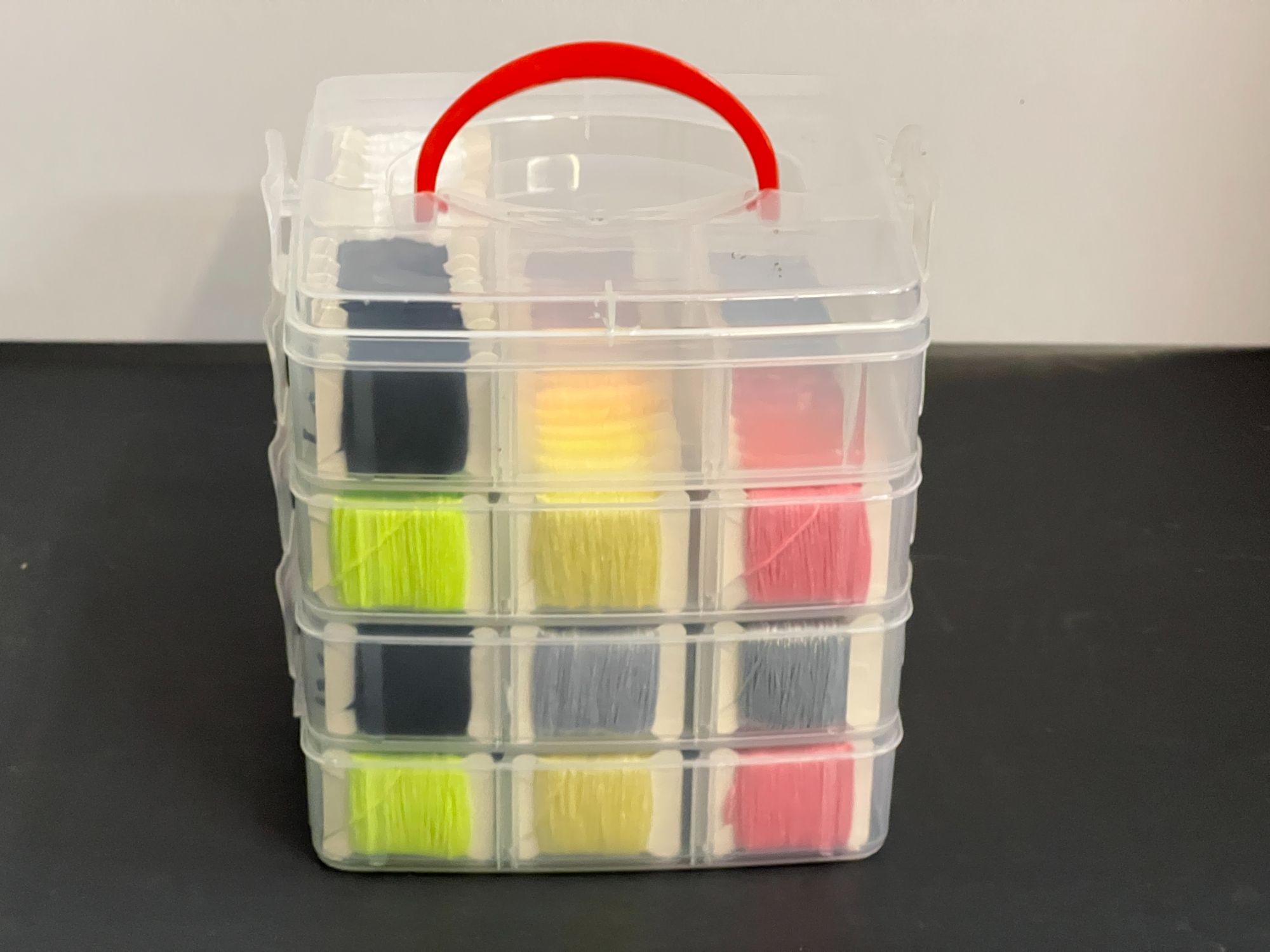 Stackable storage container of assorted embroidery thread, see pictures for details.