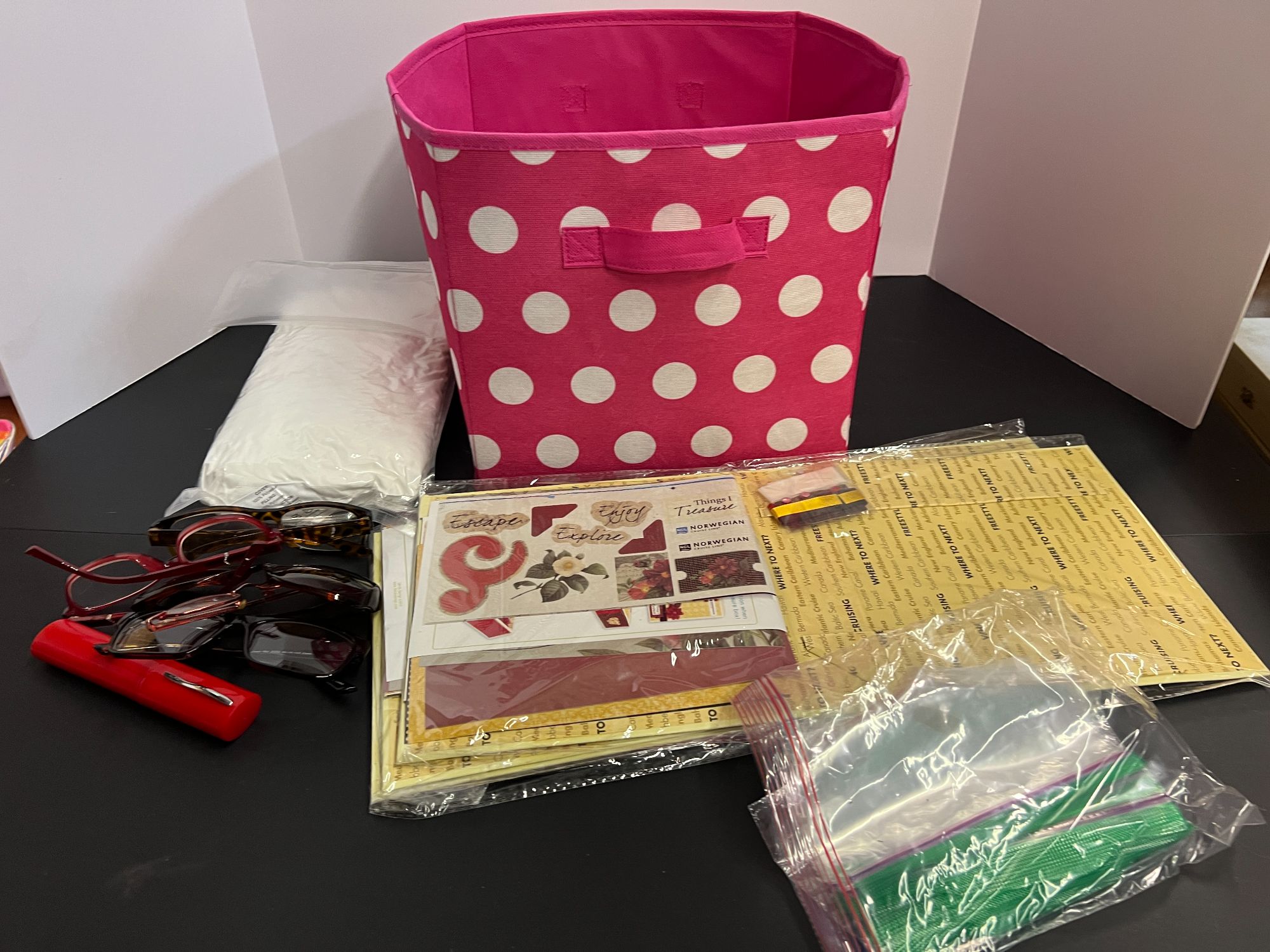 Fabric storage cube with assorted crafting items and more, see pictures for details.