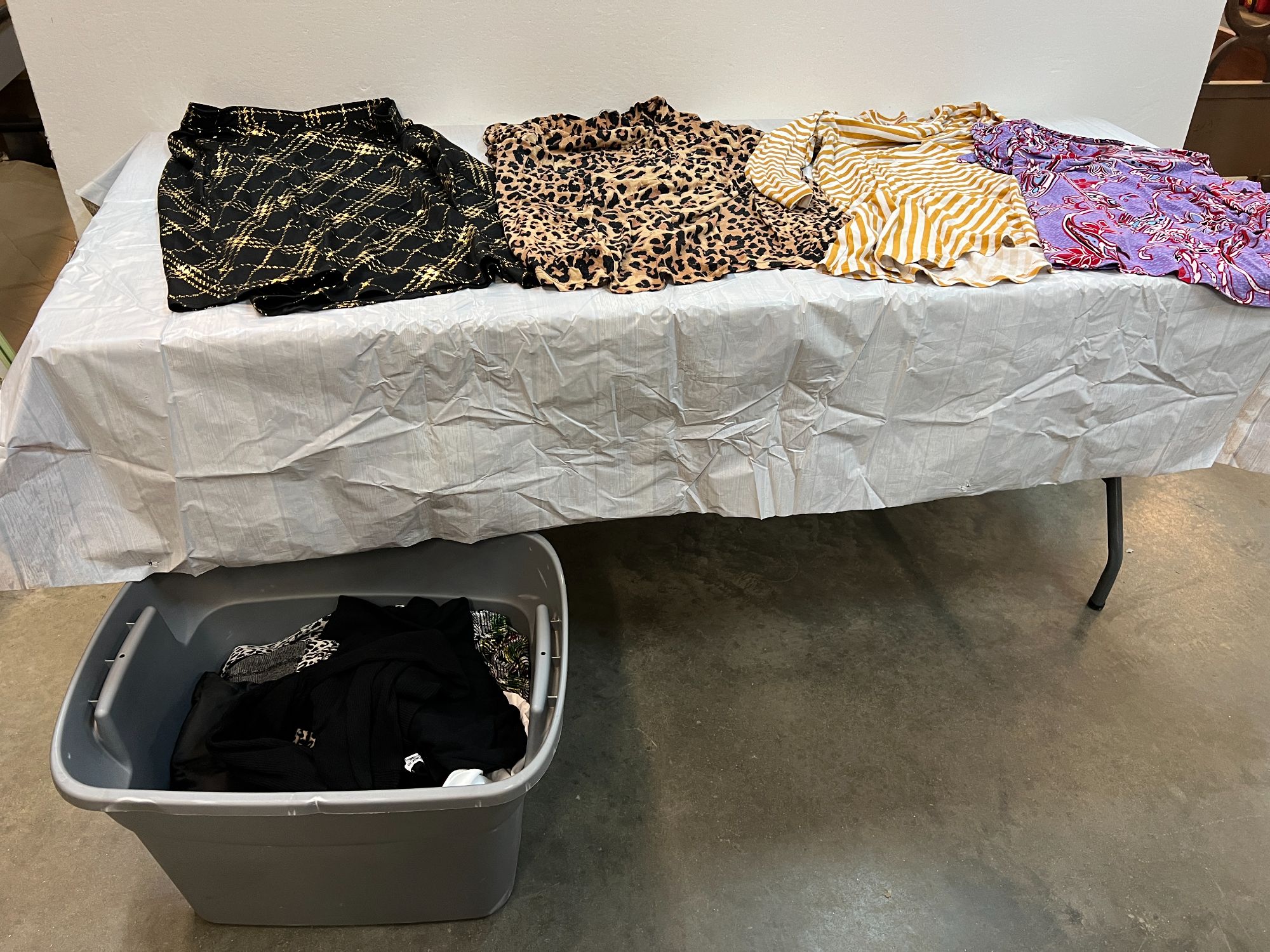 Tub of assorted ladies apparel, assorted sizes, please inspect for size and fashion, see pictures for details.