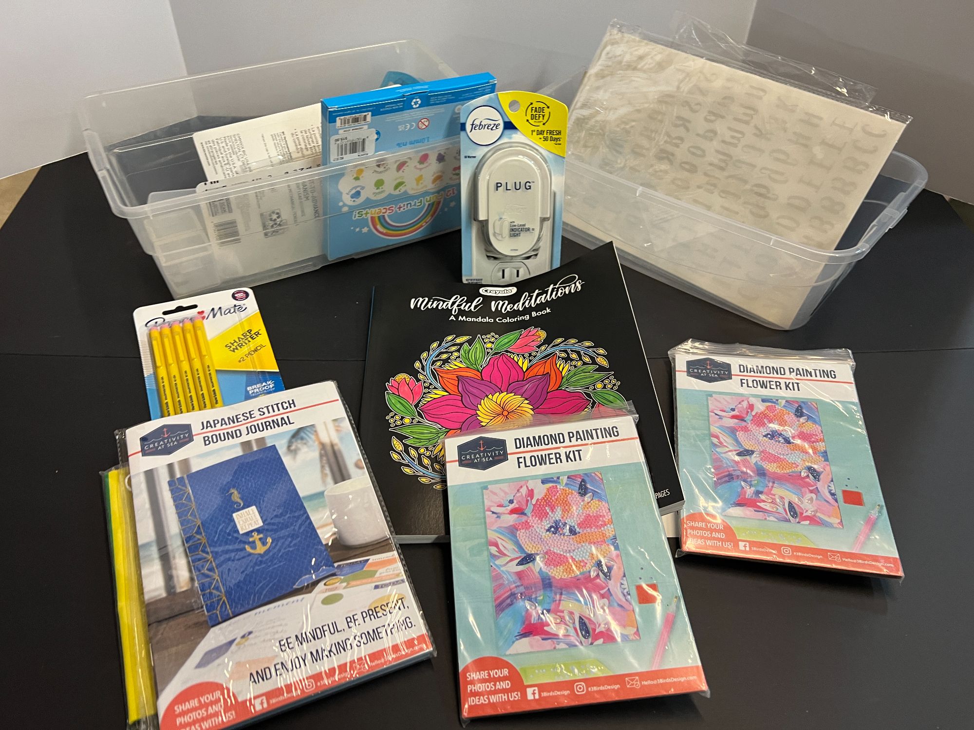 Shelf lot marked 5133 to include assorted household and crafting supplies, and more. Tubs are not included, see pictures for details.