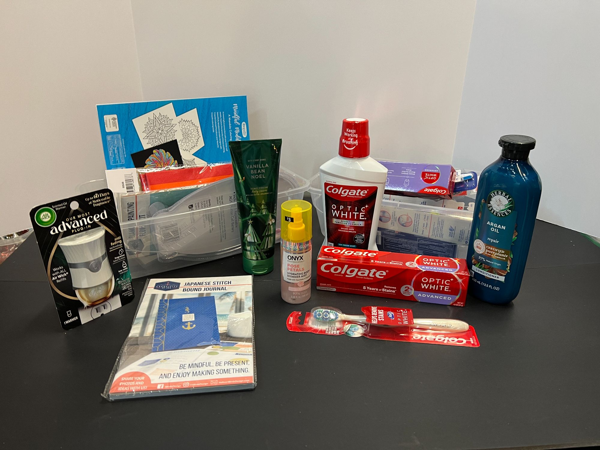 Shelf lot marked 5136 to include assorted crafting supplies, toiletries, and more to include toothpaste, toothbrushes, conditioner, mouthwash, and more. Tubs are not included, See pictures for details.