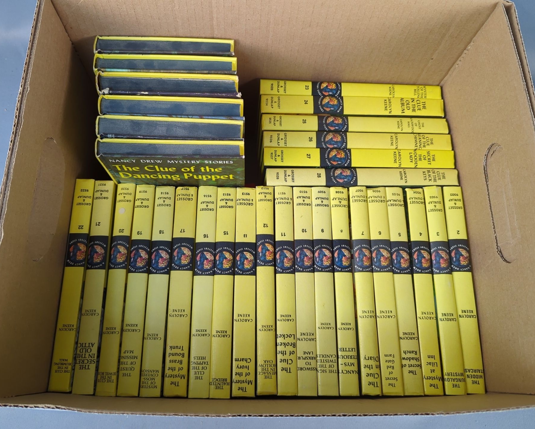 Nancy Drew Mystery books by Carolyn Keene, featuring titles such as "The Clue of the Dancing Puppet," "The Secret of Red Gate Farm," and more. Total qty 32.