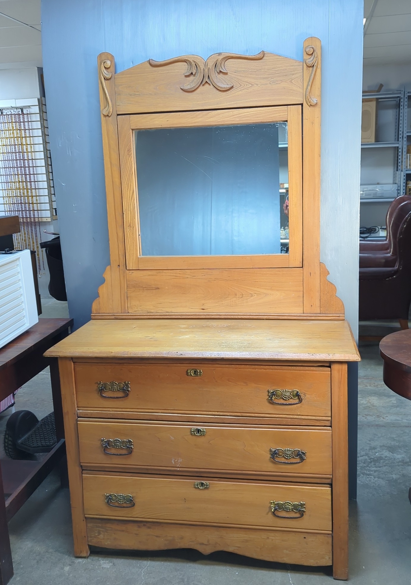 Hand crafted 3 drawer dresser and attached tilt mirror. Features dovetailed drawers and decorative metal drawer pulls. Measurements approximately: 71.5" x 41.5" x 18". No key. Has wear.