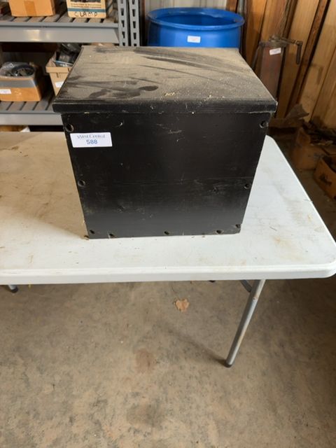 A small wooden storage box. It is painted black on the exterior and has a hinged lid with a natural wood interior. Appears well constructed.