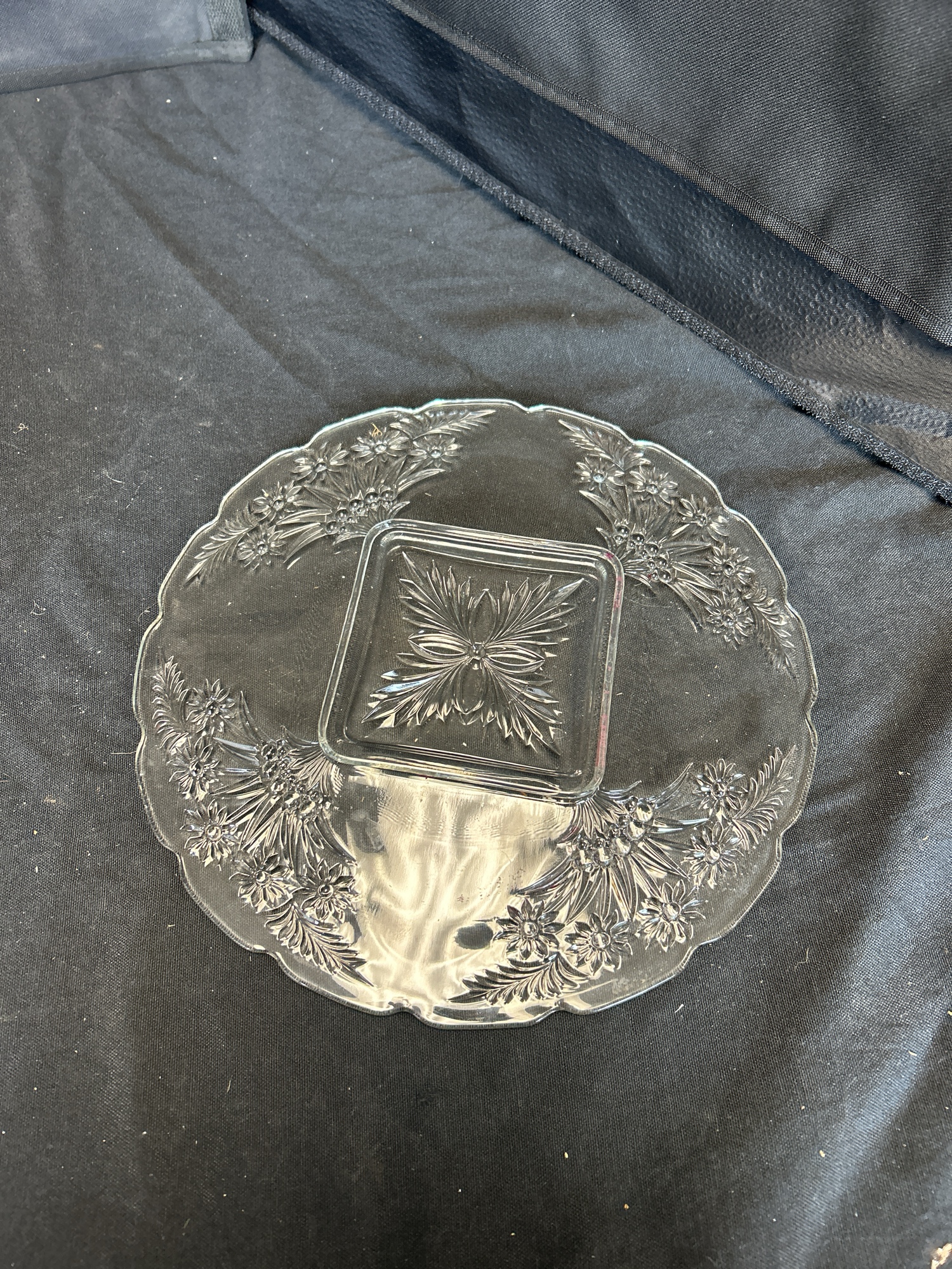Clear glass plate with etched floral design, complete with decorative metal stand for display.