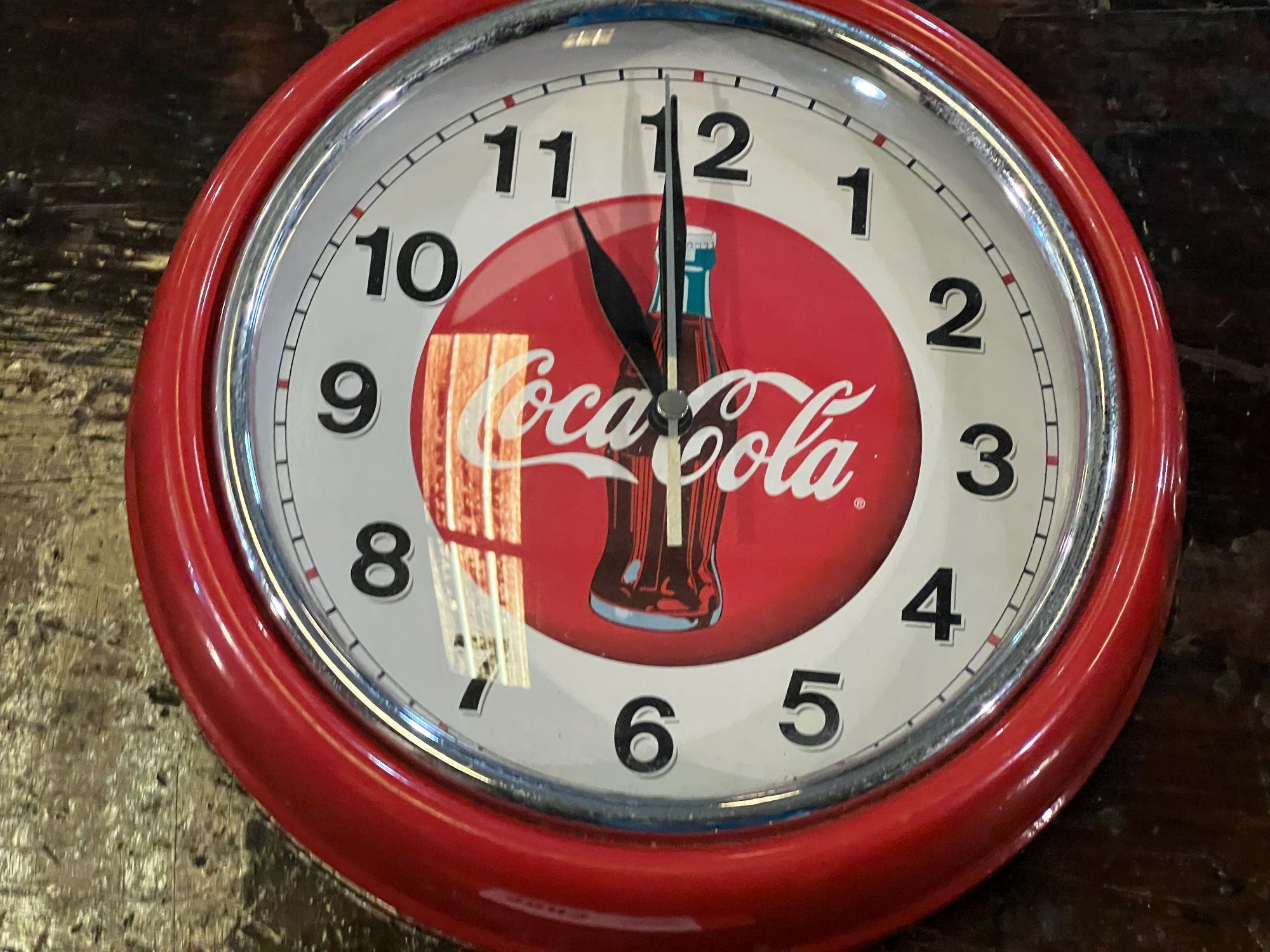 Battery operated Coca-Cola wall clock, see Patricia for details.