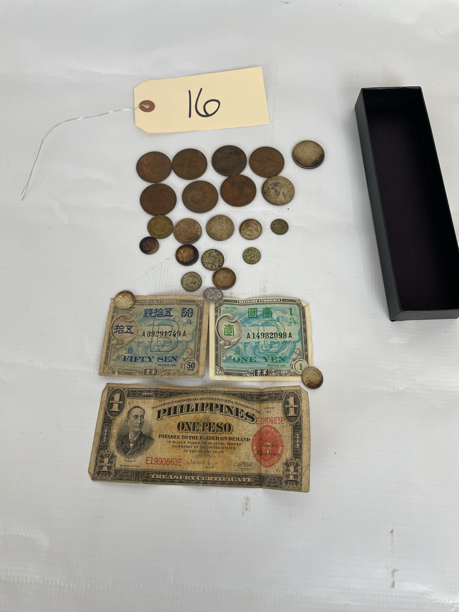 Collection of 1943 Australian currency, including six pennies, two shillings, two florin, and two six pence. Also includes other foreign currencies as shown.