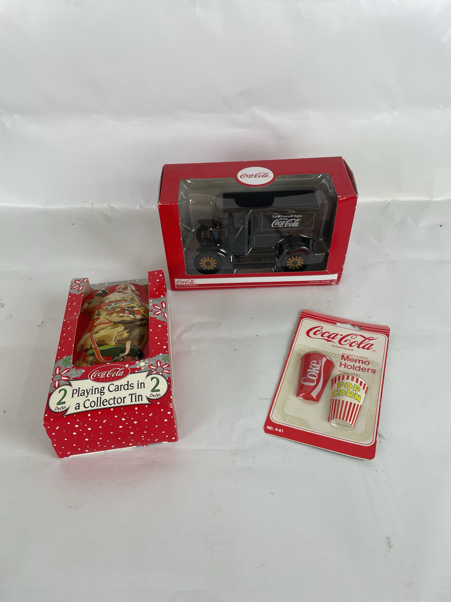 Set of Coca-Cola collectibles including playing cards in a collector tin, memo holders, and a 1917 Ford Model T 1/24 die cast car.