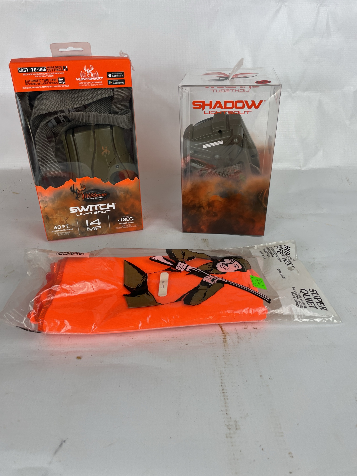 Includes two Wildgame Innovations trail cameras, one "Switch Light Scout" and one "Shadow Lightsout" model, along with a hunter safety vest.