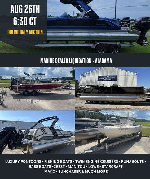 Buyer will be invoiced for the 10% down payment that is due within 24 hours of auction close. Balance must be paid at the dealership in which the boat is located (either Dadeville, AL or Foley, AL) by August 31, 2025. *** NO EXCEPTIONS***