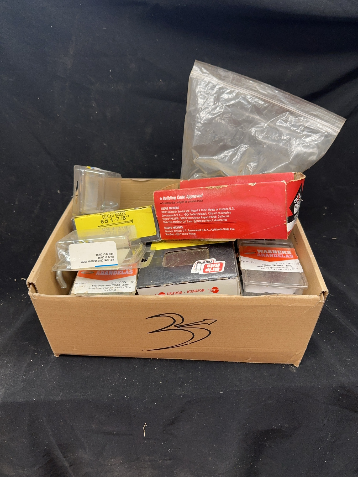 Includes a collection of various fasteners, such as sleeve anchors, coated sinker nails, screws, and assorted washers. Brands include Grip Rite and Arandelas. Contents are housed in a cardboard box.